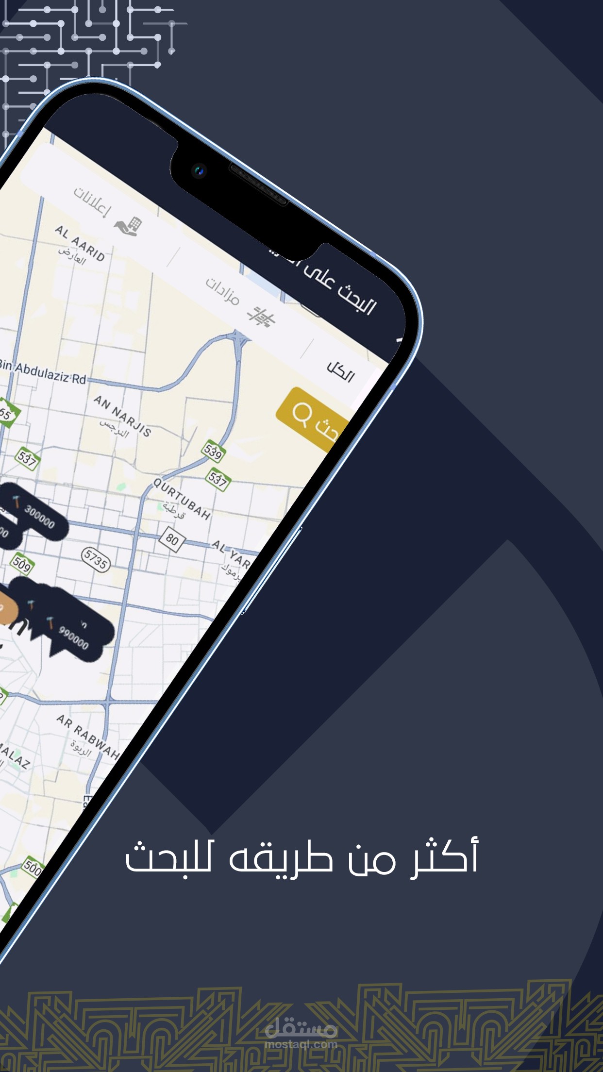 كما يوفّر خاصية البحث على الخريطة بحيث يمكن للمستخدم استعراض العقارات والمزادات المتاحة في موقعه الحالي أو في أي منطقة يختارها.