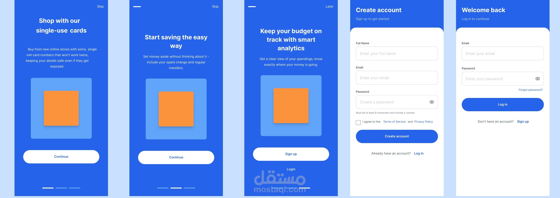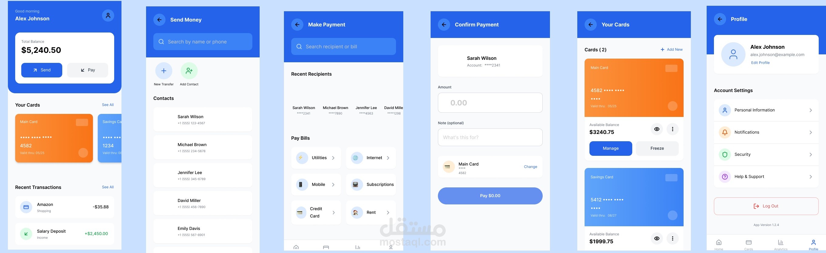 تستخدم واجهة التطبيق ألوان الأزرق والأبيض والبرتقالي لتعكس الثقة والبساطة والوضوح، وهي ألوان شائعة في تطبيقات الخدمات المالية الحديثة.