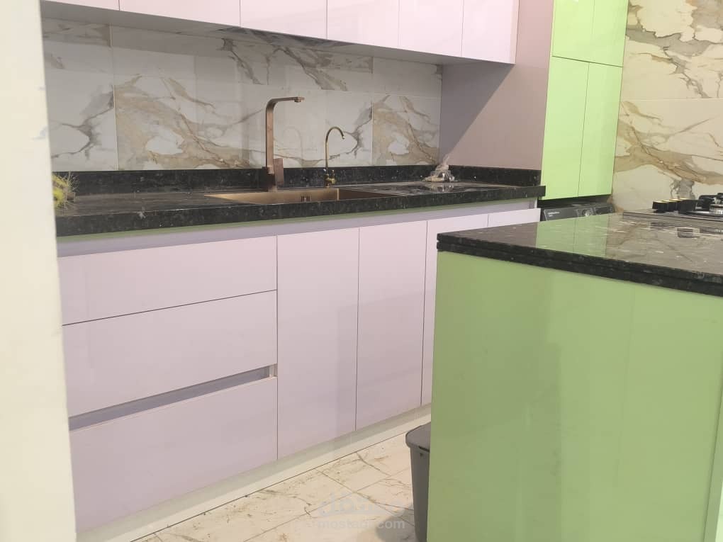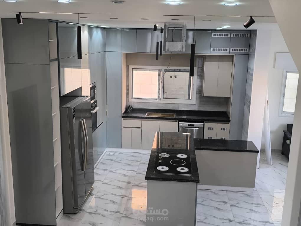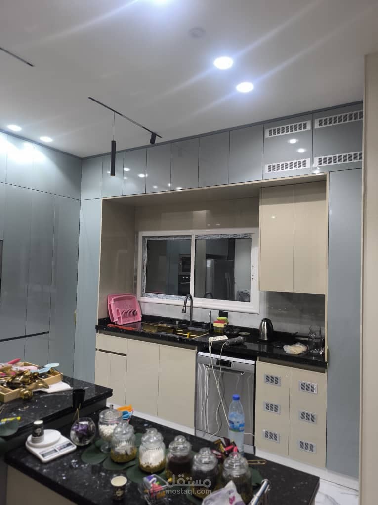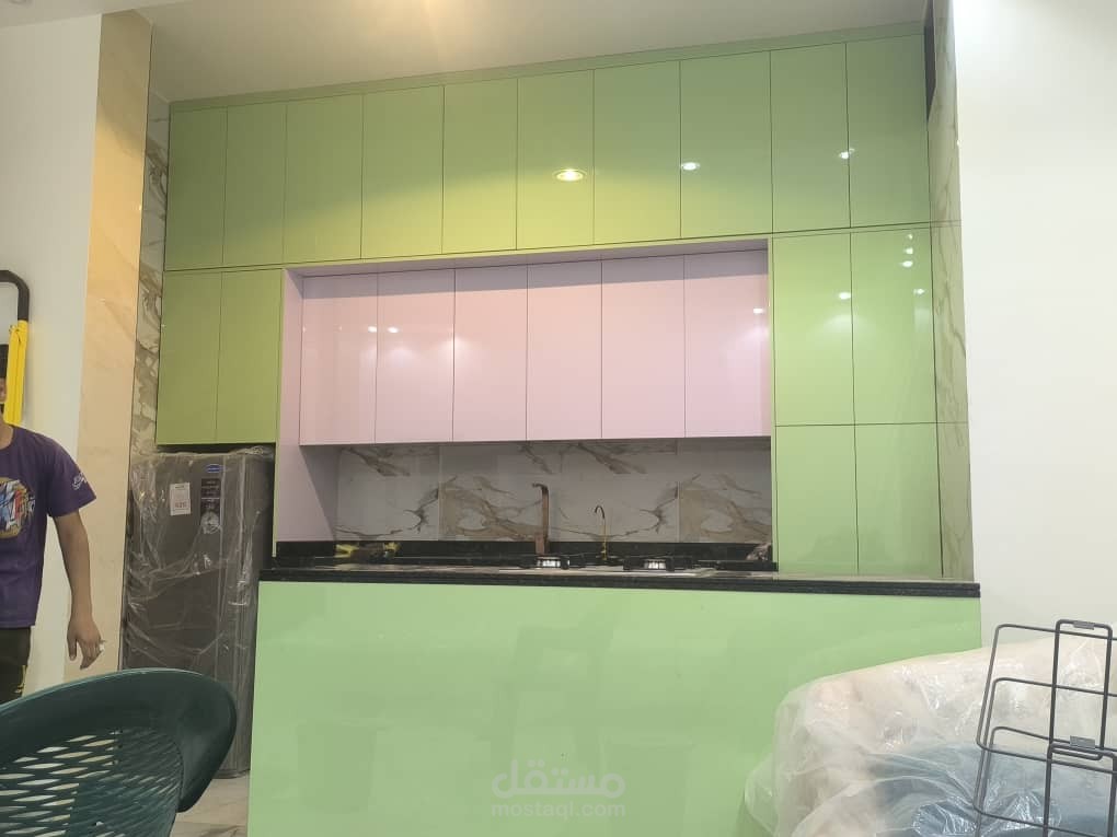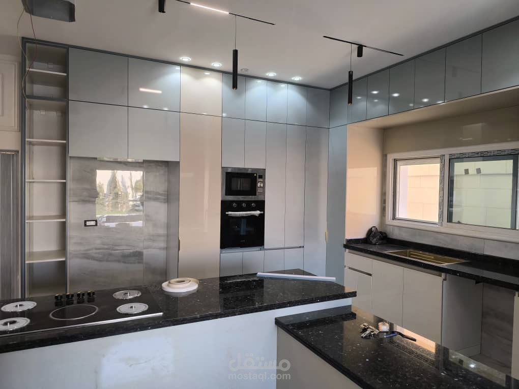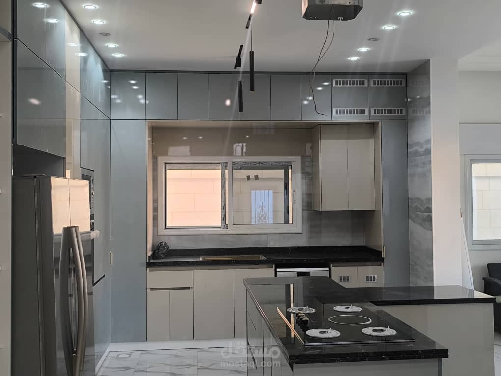تم تصميم مطبخ مودرن وبوفيه مودرن من ألوان عصرية اختارها العميل تعكس حيوية وتميز لانظير له مع مراعاة ادخال الوان مثل الرمادي والبيج لتخفيف حدة الألوان واعطاءها هدوء بصري