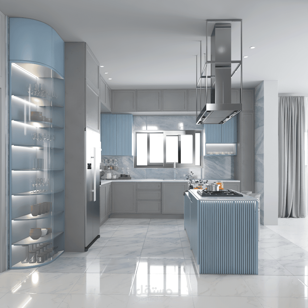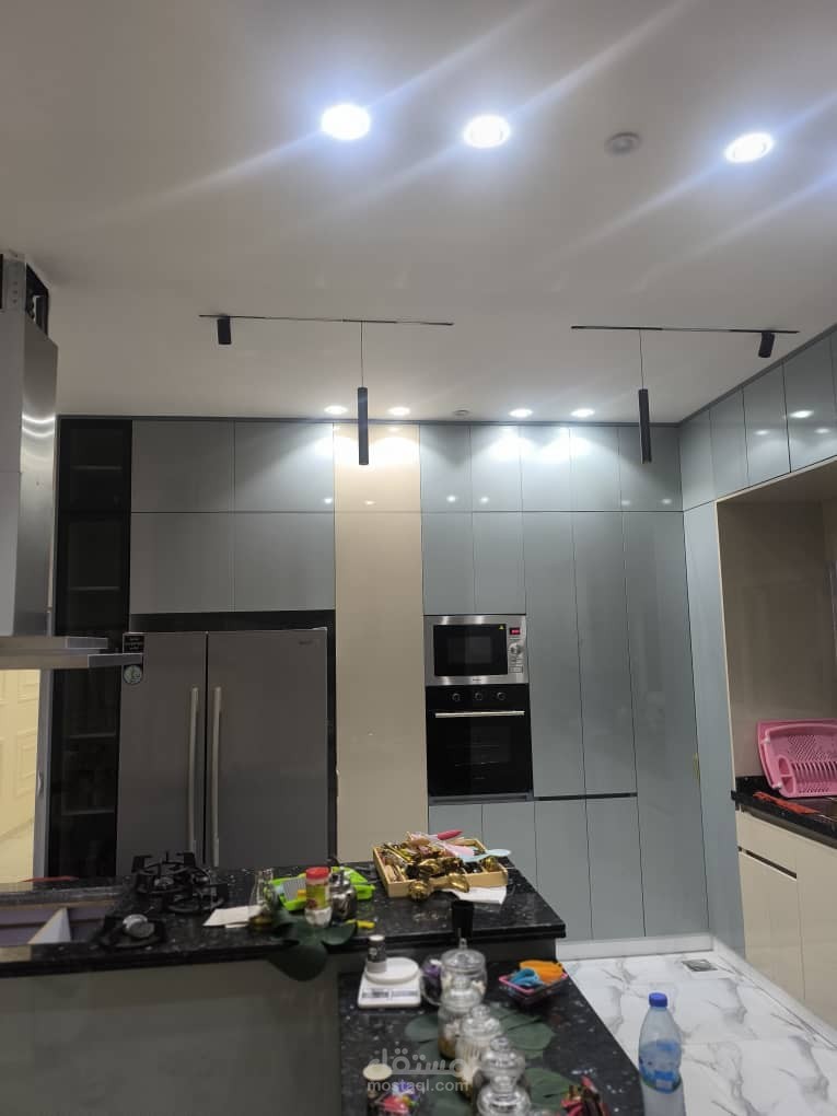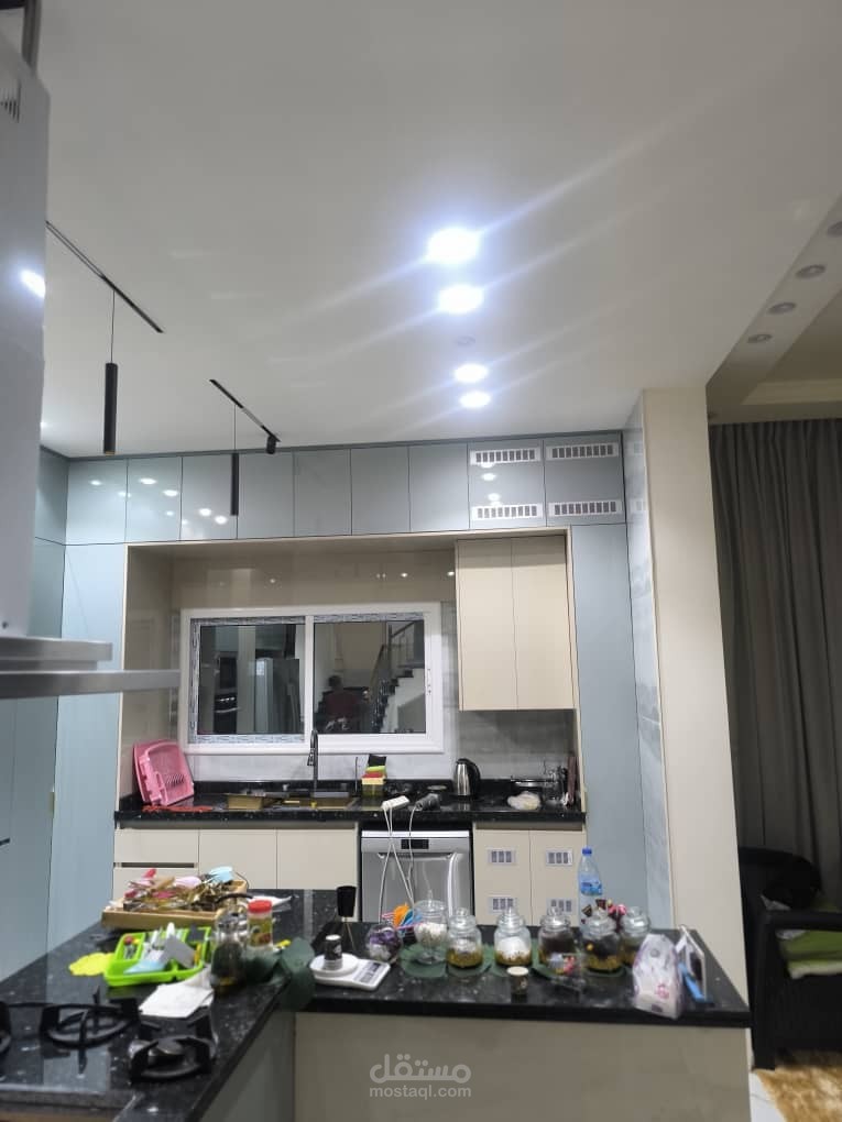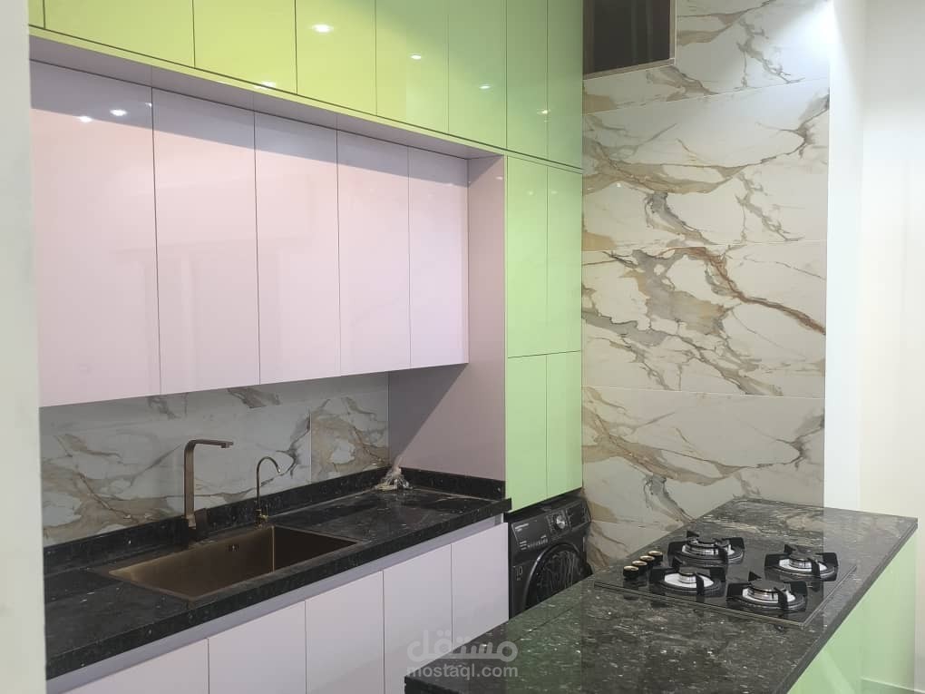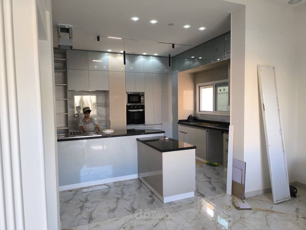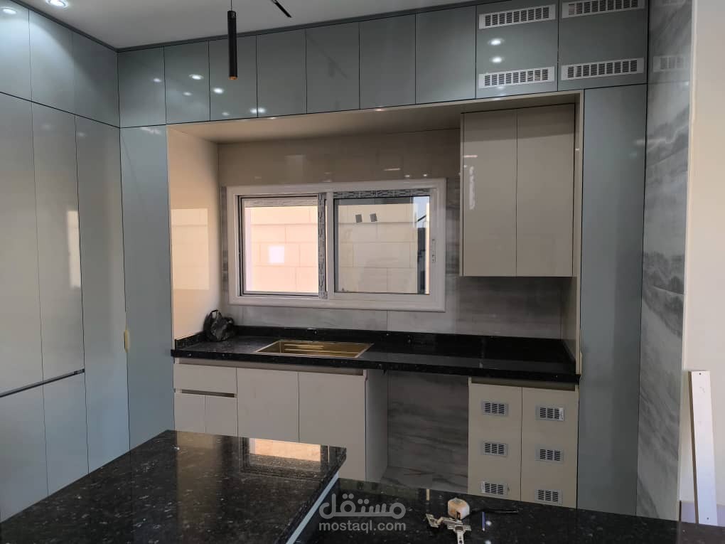 تم تصميم مطبخ مودرن وبوفيه مودرن من ألوان عصرية اختارها العميل تعكس حيوية وتميز لانظير له مع مراعاة ادخال الوان مثل الرمادي والبيج لتخفيف حدة الألوان واعطاءها هدوء بصري