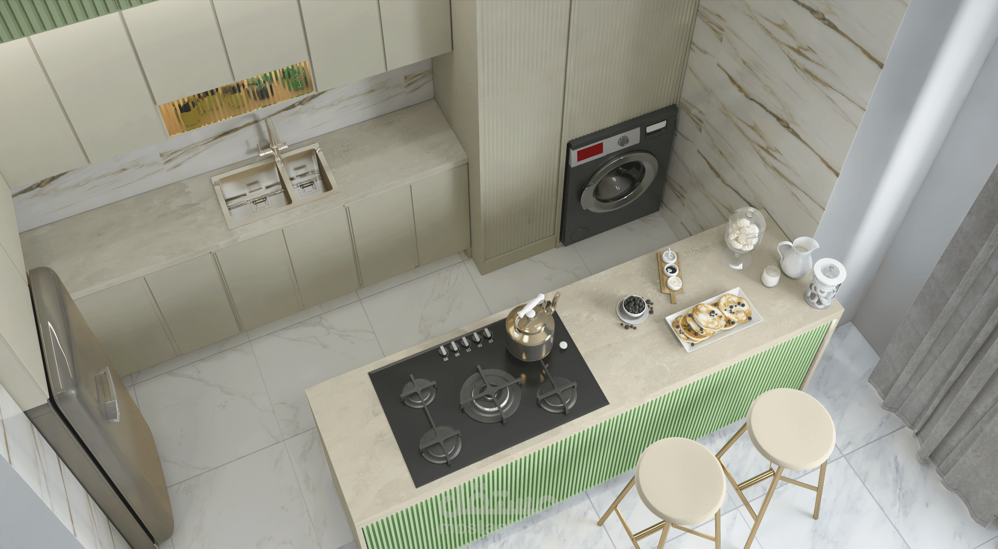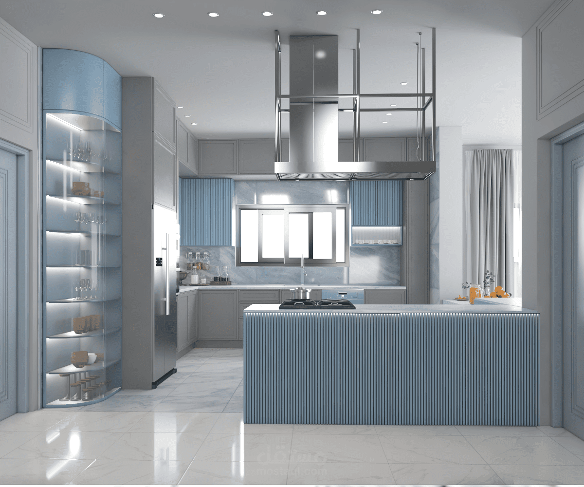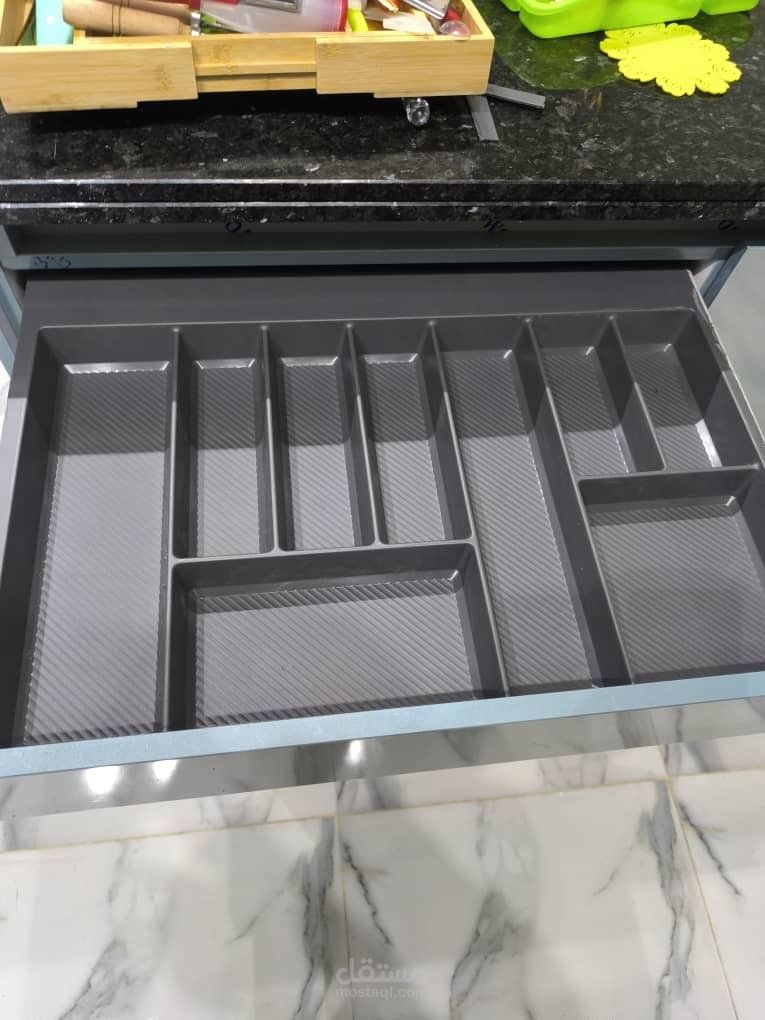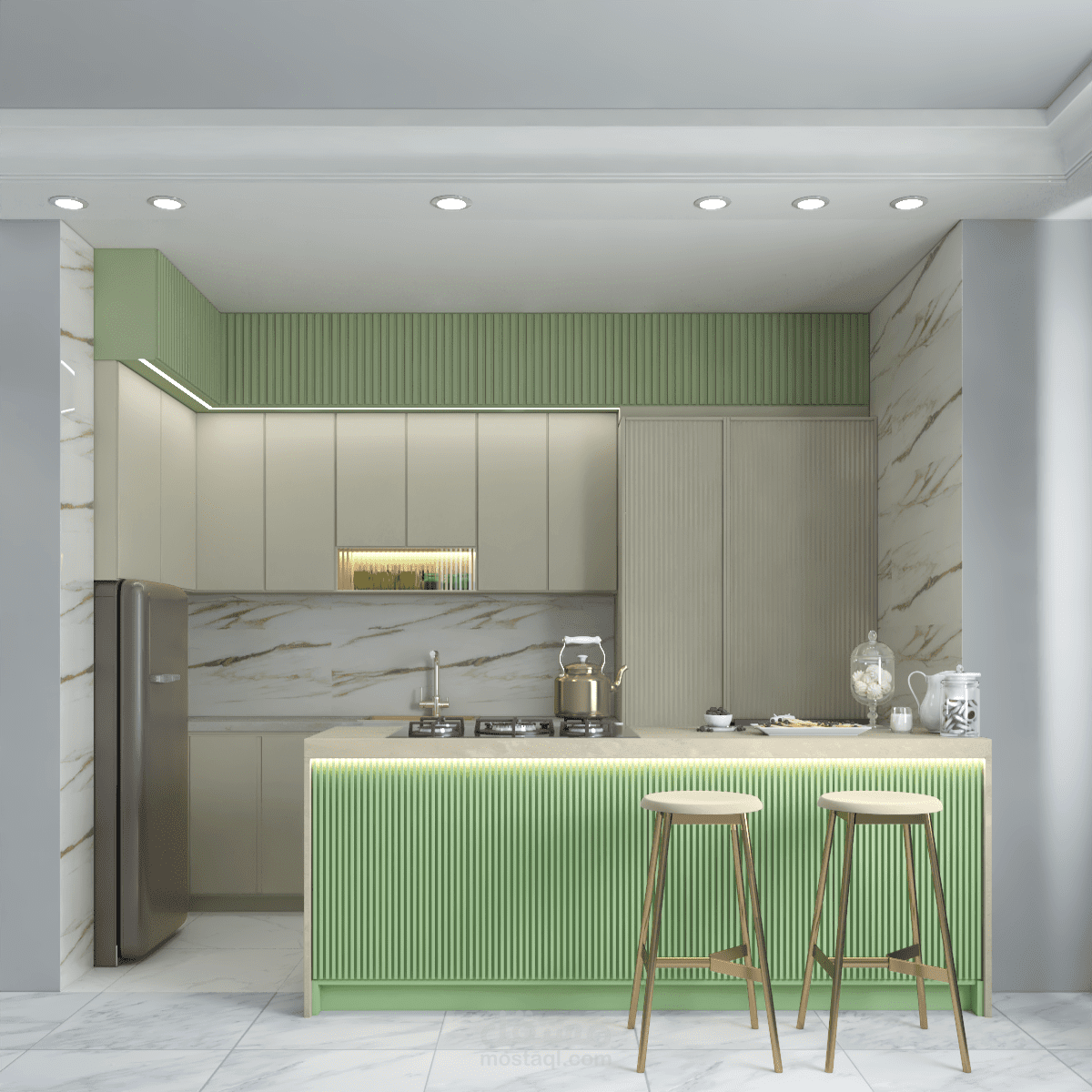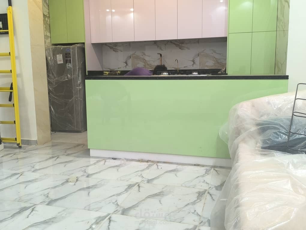 تم تصميم مطبخ مودرن وبوفيه مودرن من ألوان عصرية اختارها العميل تعكس حيوية وتميز لانظير له مع مراعاة ادخال الوان مثل الرمادي والبيج لتخفيف حدة الألوان واعطاءها هدوء بصري