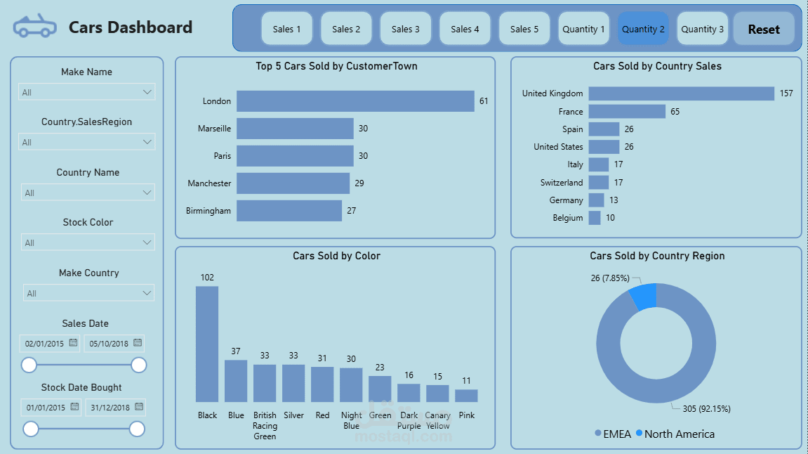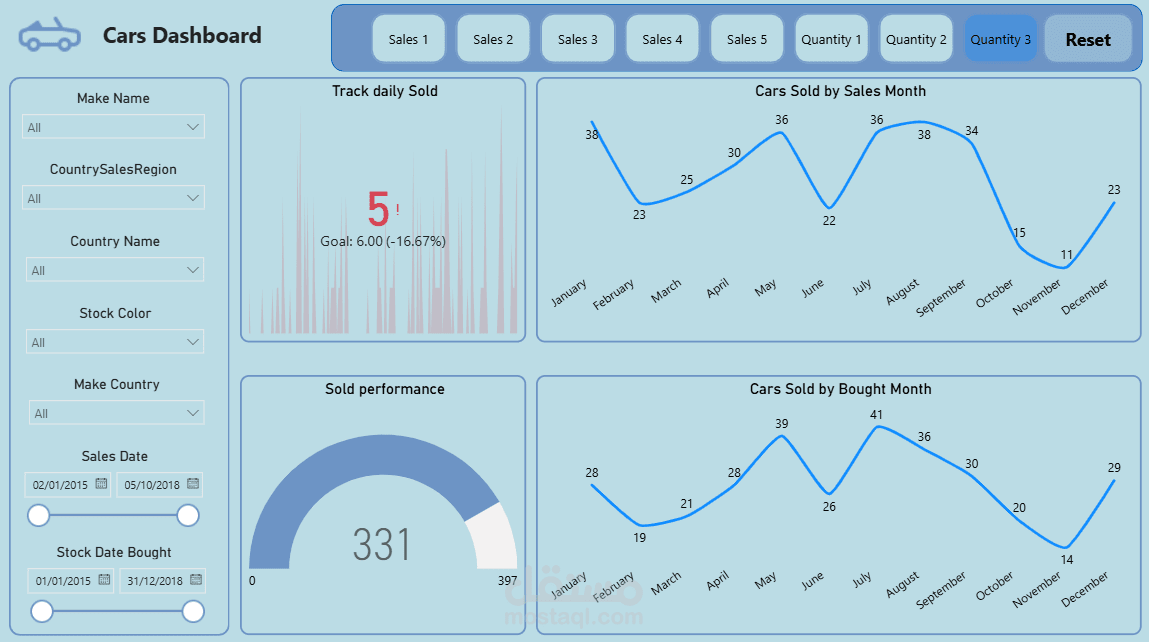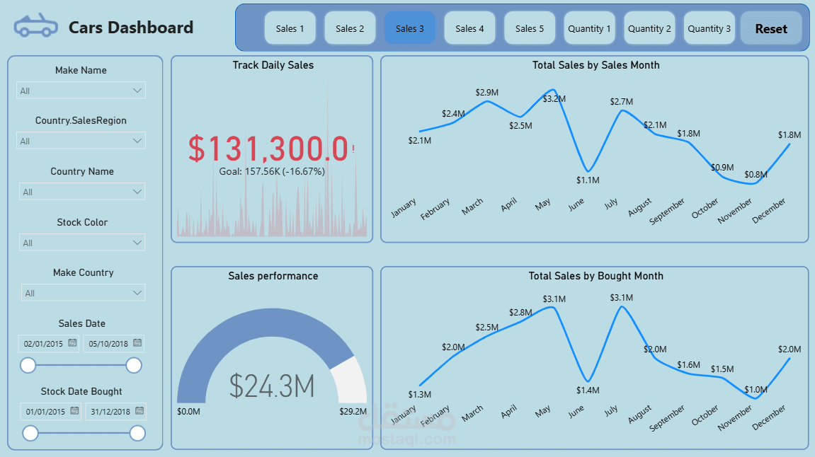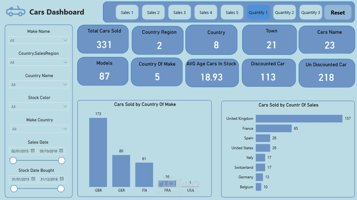يحتوي الجانب الأيسر على مجموعة فلاتر ديناميكية تسمح بتخصيص وتحليل البيانات حسب اسم السيارة، المنطقة، الدولة، اللون، بلد الصنع، تاريخ البيع، وتاريخ شراء المخزون، ممّا يدعم عمليات التحليل التفصيلي لمختلف المتغيرات.