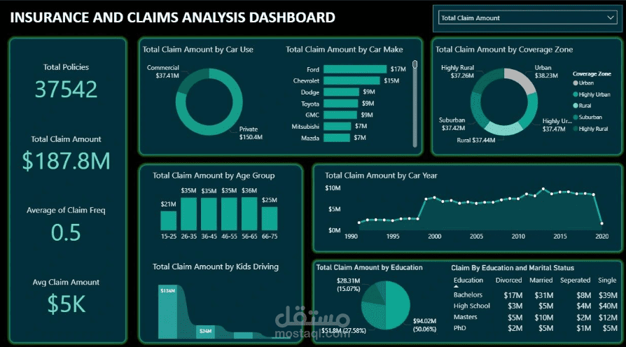 تم تصميم لوحة تحكم تفاعلية لتحليل بيانات مطالبات التأمين، بهدف تتبع حجم المطالبات وتوزيعها حسب نوع الاستخدام، الشركة المصنعة، المنطقة الجغرافية، الفئة العمرية، وسنوات المطالبات.