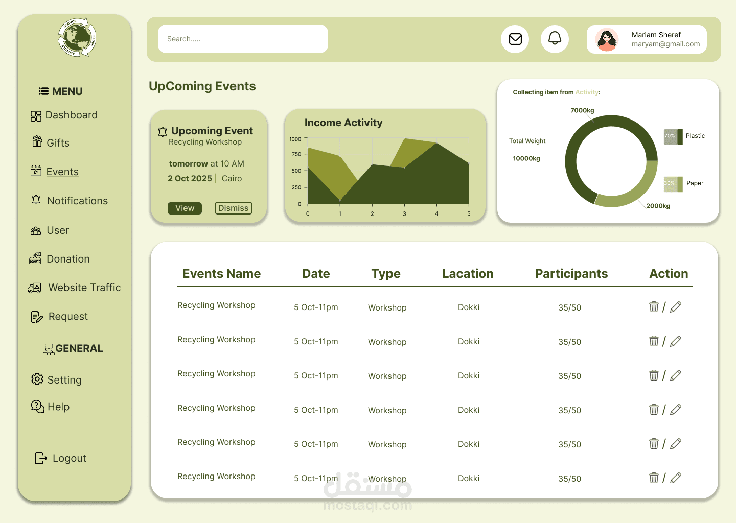 قمت بتصميم لوحة تحكم (Dashboard) لموقع يهتم بعمليات إعادة التدوير والحفاظ على البيئة. ركزت في التصميم على: