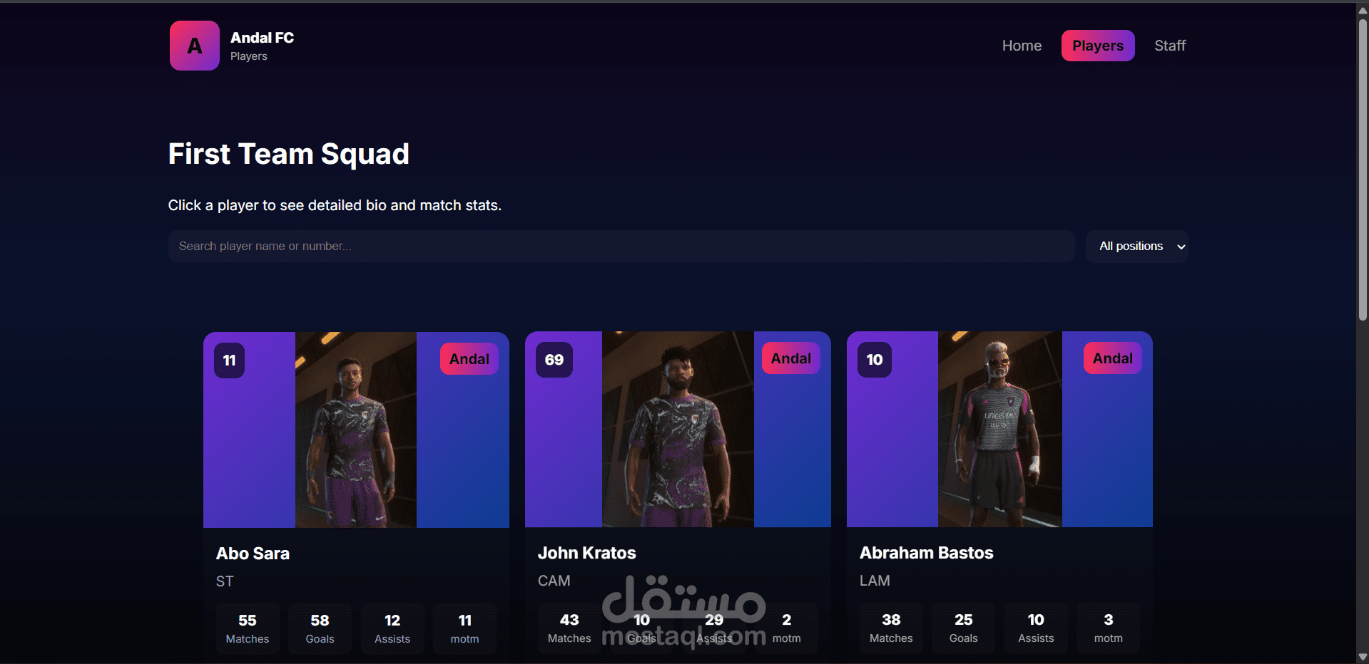 يقدّم الموقع أقسامًا متنوعة مثل اللاعبين، الطاقم الفني، المباريات القادمة، وملخصات الموسم، بتصميم مستوحى من مواقع الأندية الحقيقية.