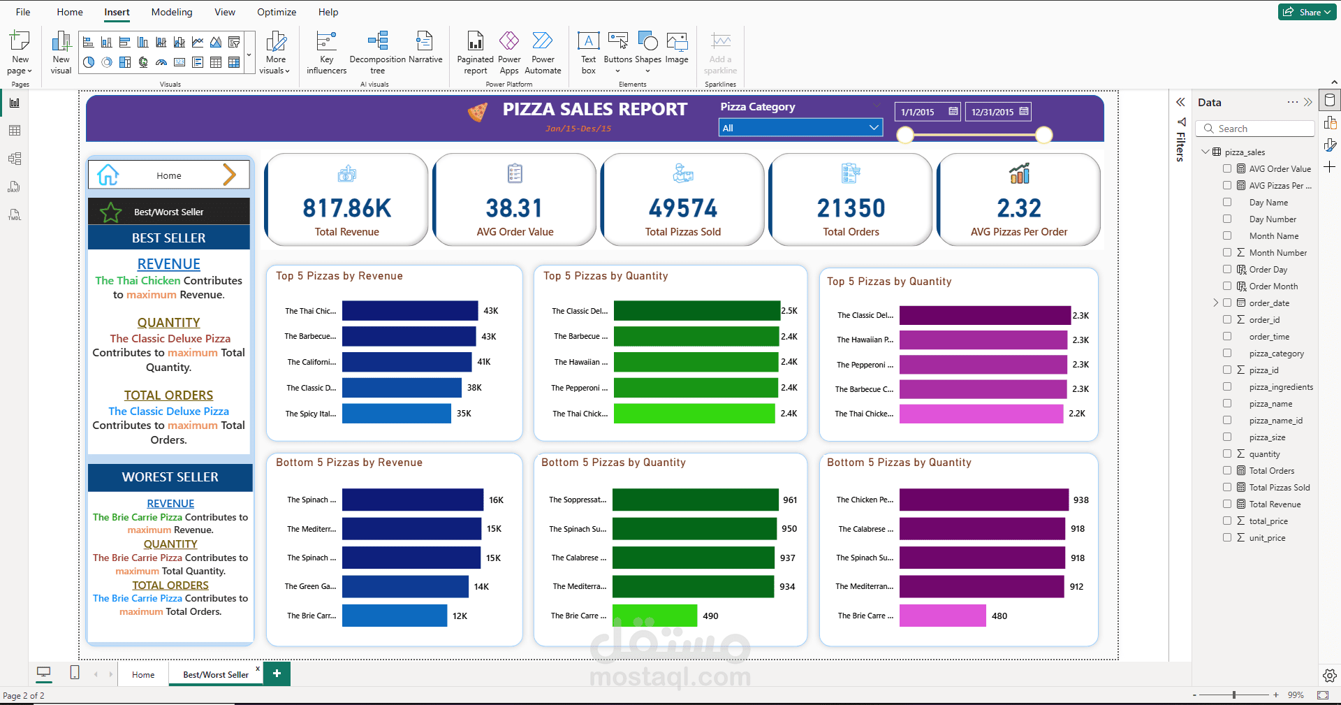 شملت مؤشرات رئيسية مثل: الإيرادات الكلية، متوسط قيمة الطلب، عدد البيتزا المباعة، عدد الطلبات ومتوسط عدد البيتزا في كل طلب.