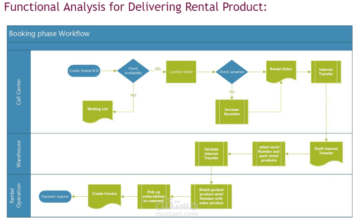 * أتمتة دورة التأجير (Workflow): تصميم مسار عمل مؤتمت وشامل لعملية التأجير، بدءاً من طلب العميل، تأكيد الحجز، التجهيز والتسليم، وصولاً إلى فحص وإعادة المعدات إلى المخزون.
