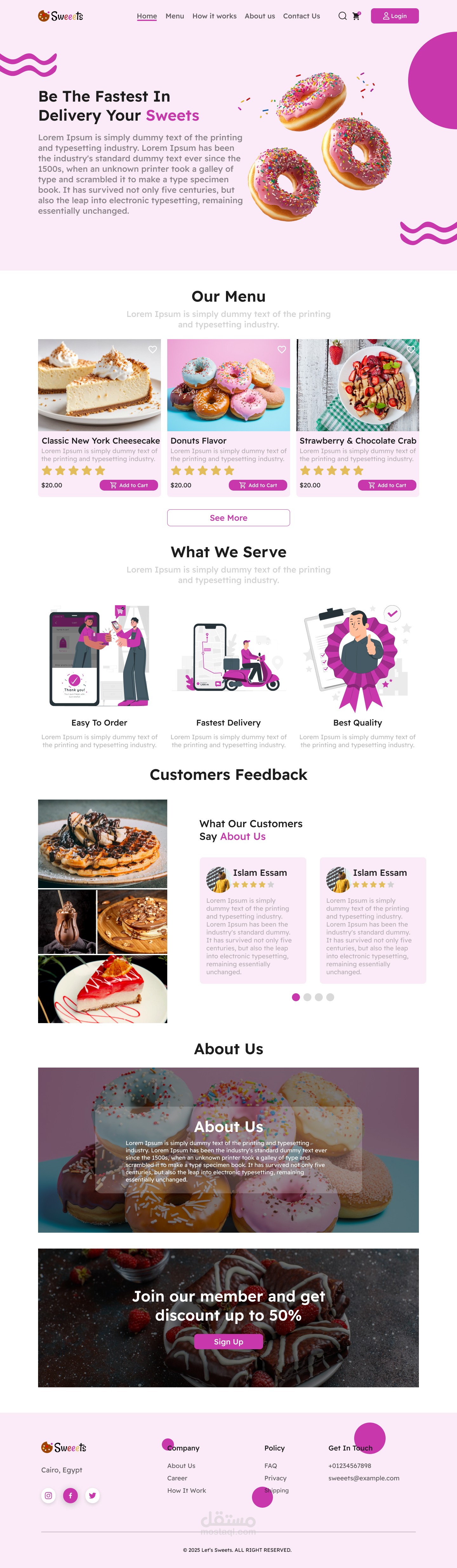 صُممت هذه الصفحة الرئيسية بالكامل باستخدام Figma ، وهو موقع إلكتروني يُتيح للمستخدمين شراء الحلويات عبر الإنترنت.