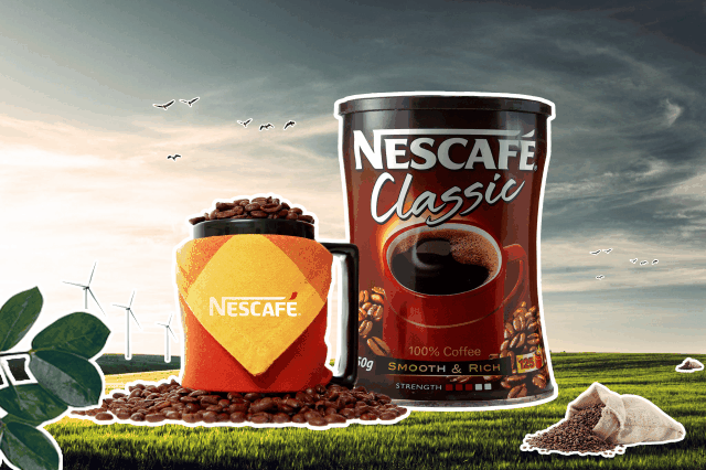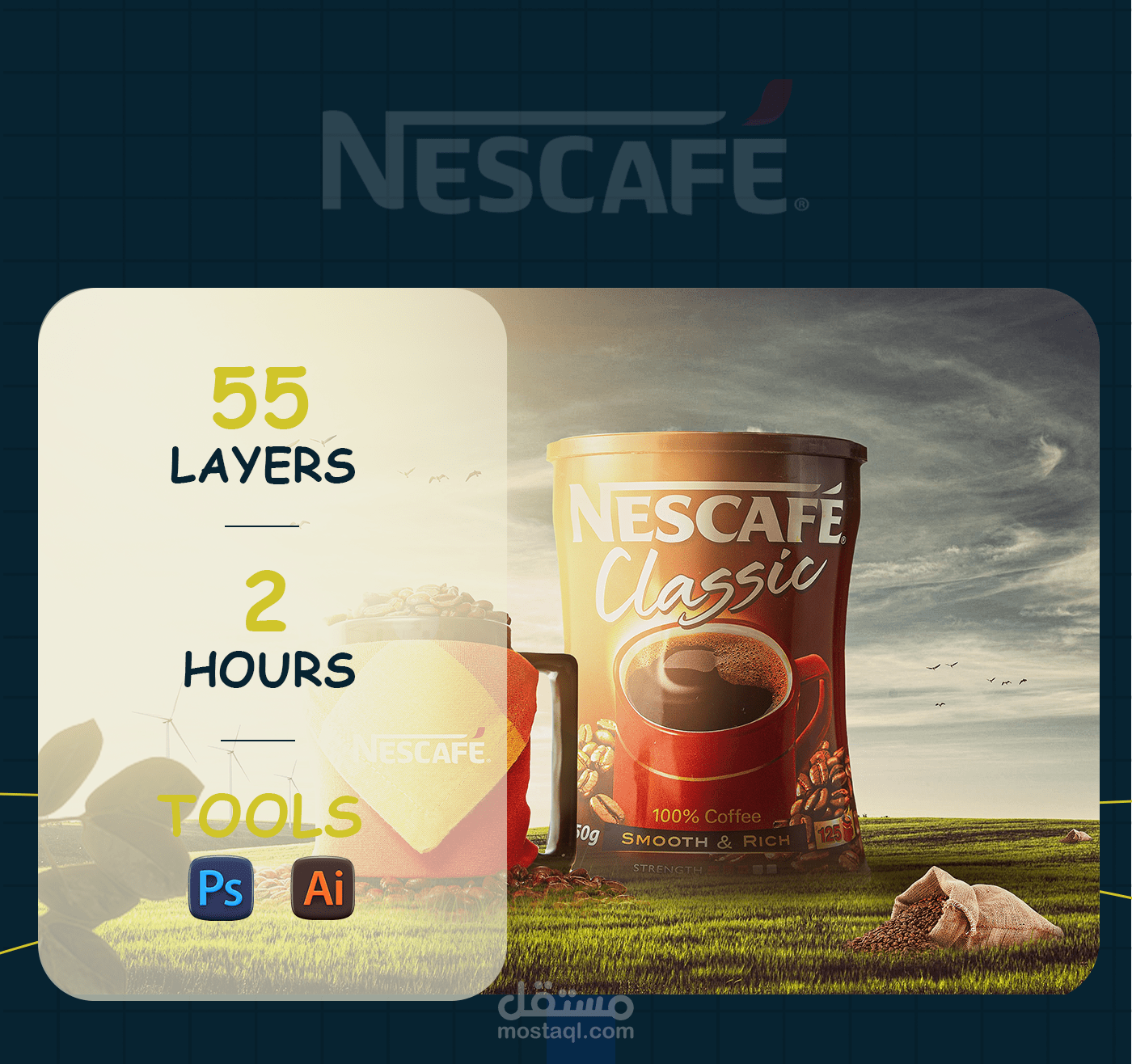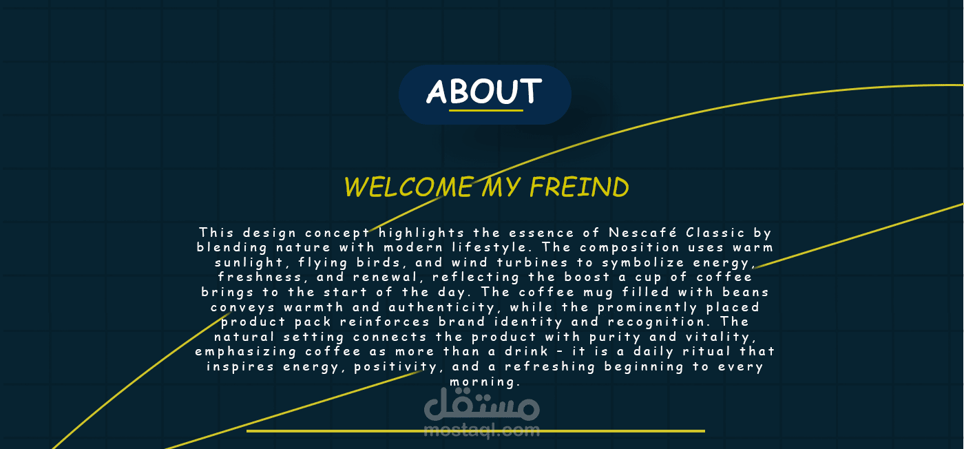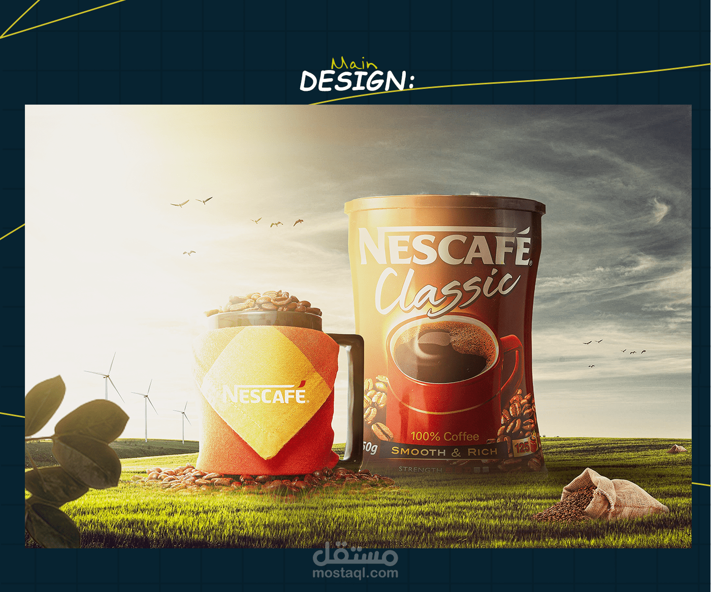 This design concept highlights the essence of Nescafé Classic by blending nature with modern lifestyle. The composition uses warm sunlight, flying birds, and wind turbines to symbolize energy. freshness, and renewal, reflecting the boost a cup of coffee brings to the start of the day. The coffee mug filled with beans conveys warmth and authenticity, while the prominently placed product pack reinforces brand identity and recognition. The natural setting connects the product with purity and vitality. emphasizing coffee as more than a drink - it is a daily ritual that inspires energy, positivity, and a refreshing beginning to every morning.