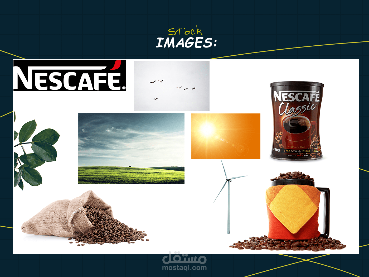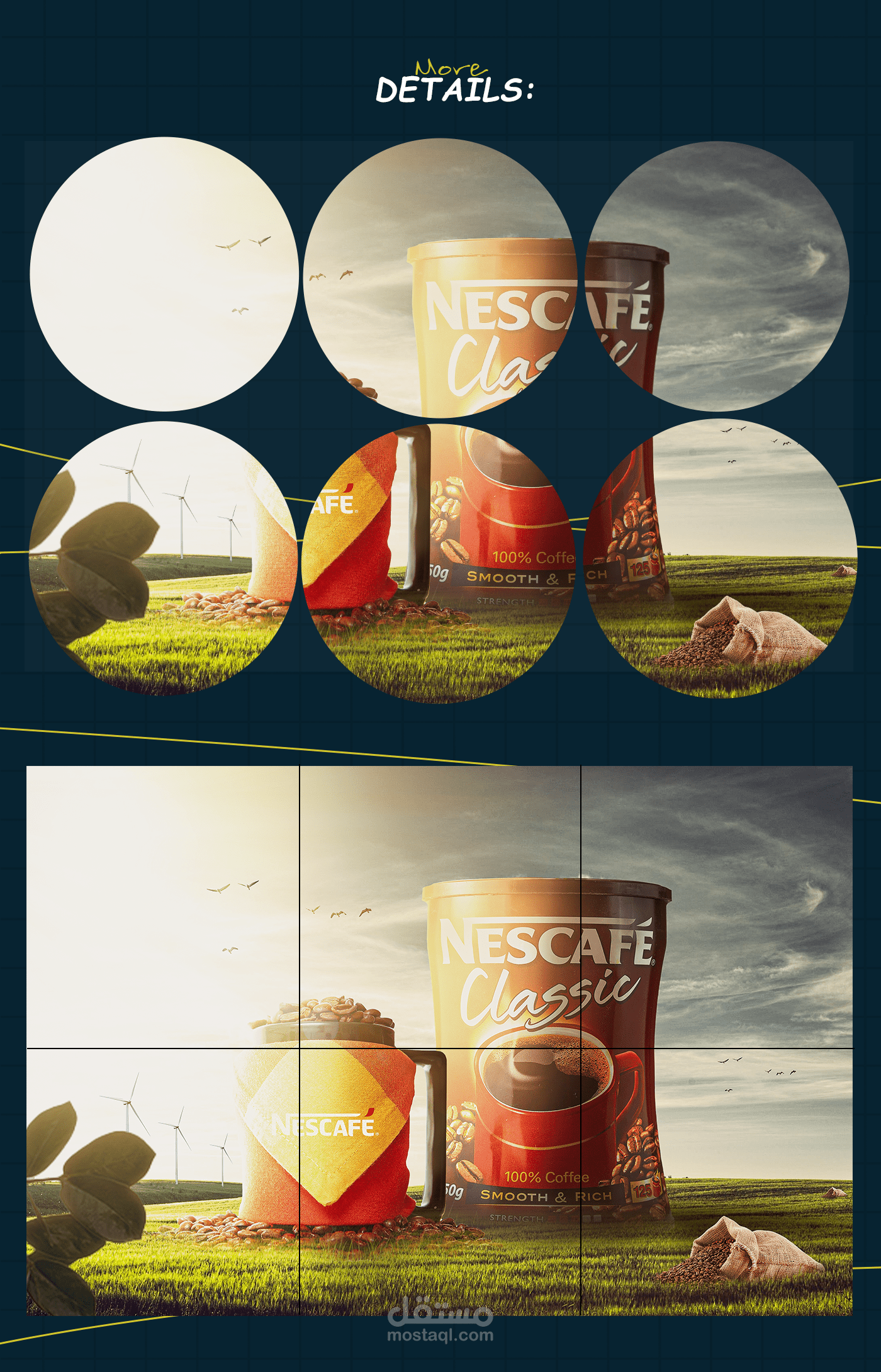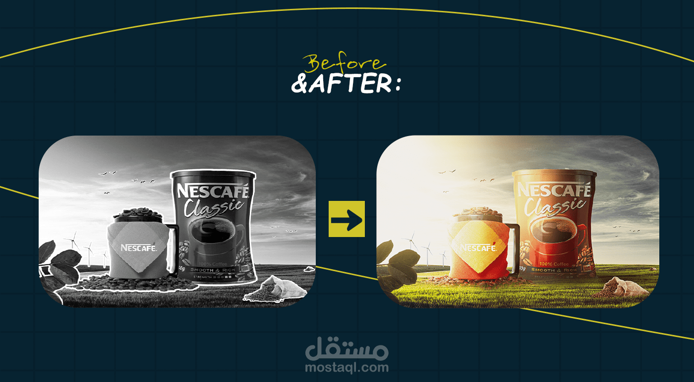 This design concept highlights the essence of Nescafé Classic by blending nature with modern lifestyle. The composition uses warm sunlight, flying birds, and wind turbines to symbolize energy. freshness, and renewal, reflecting the boost a cup of coffee brings to the start of the day. The coffee mug filled with beans conveys warmth and authenticity, while the prominently placed product pack reinforces brand identity and recognition. The natural setting connects the product with purity and vitality. emphasizing coffee as more than a drink - it is a daily ritual that inspires energy, positivity, and a refreshing beginning to every morning.