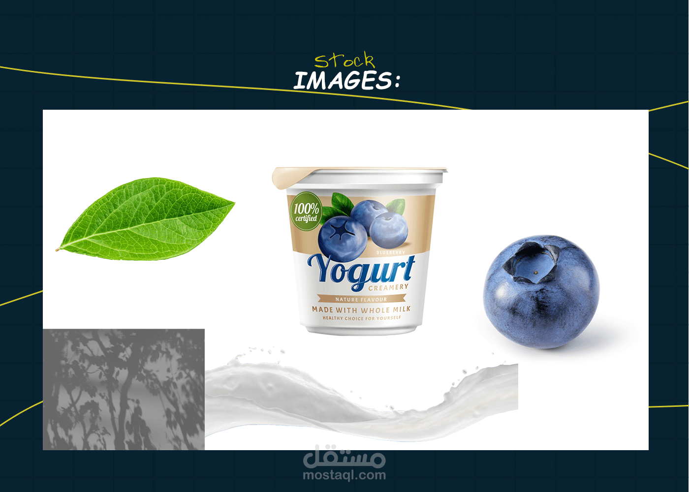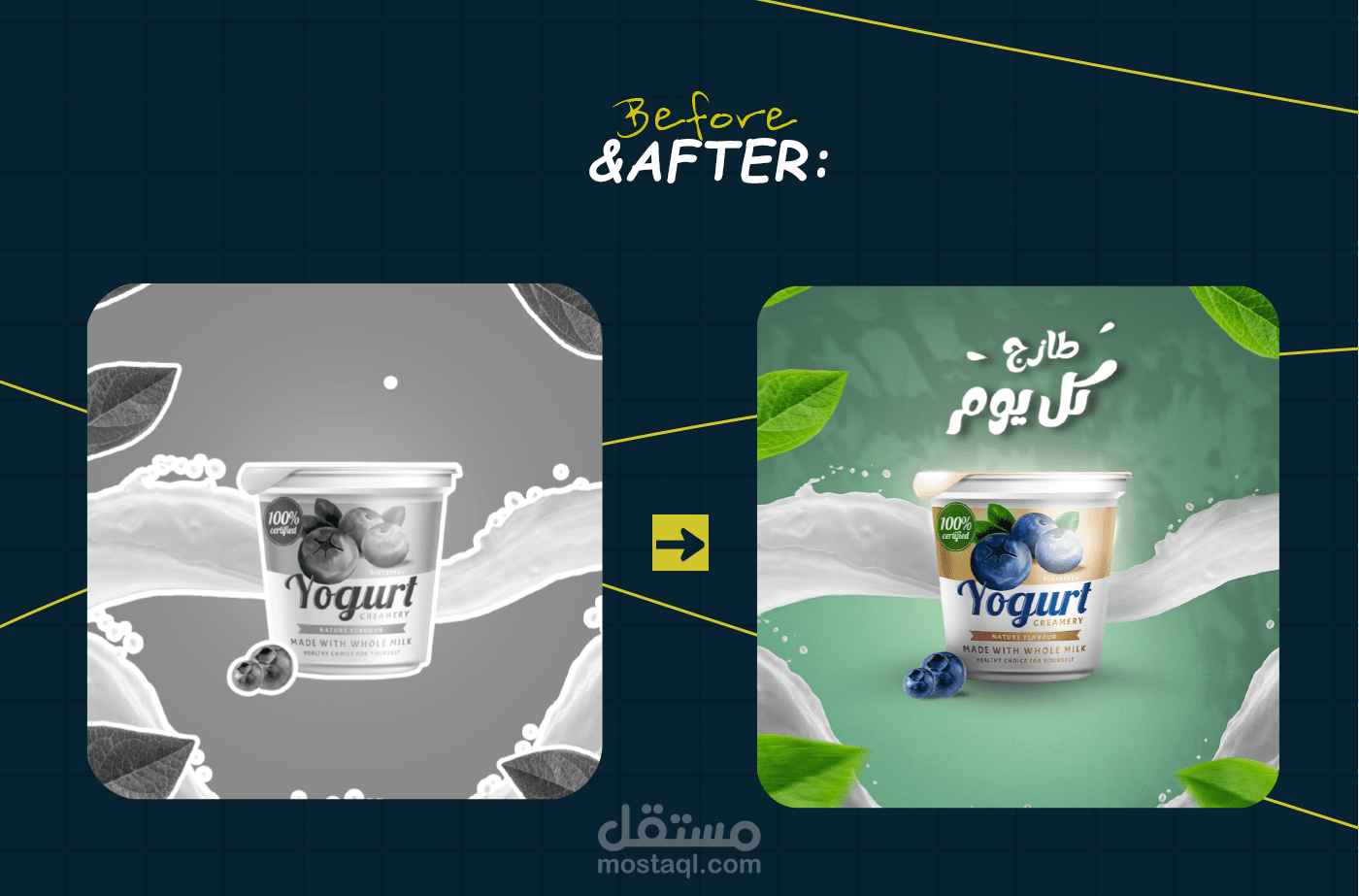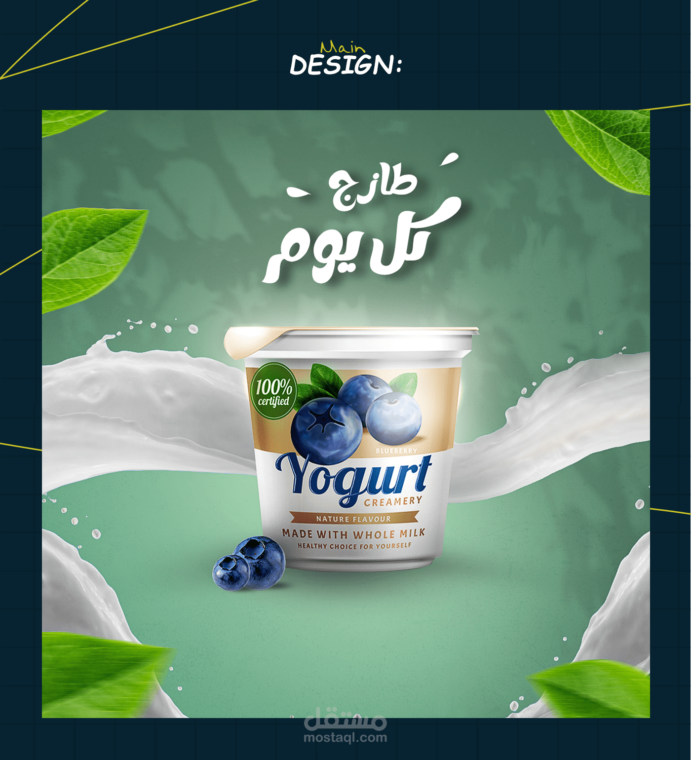 This yogurt packaging design highlights freshness and natural quality through a clean and dynamic visual style. The product cup is placed at the center as the hero element, supported by flowing milk splashes that create movement and naturally guide the eye.