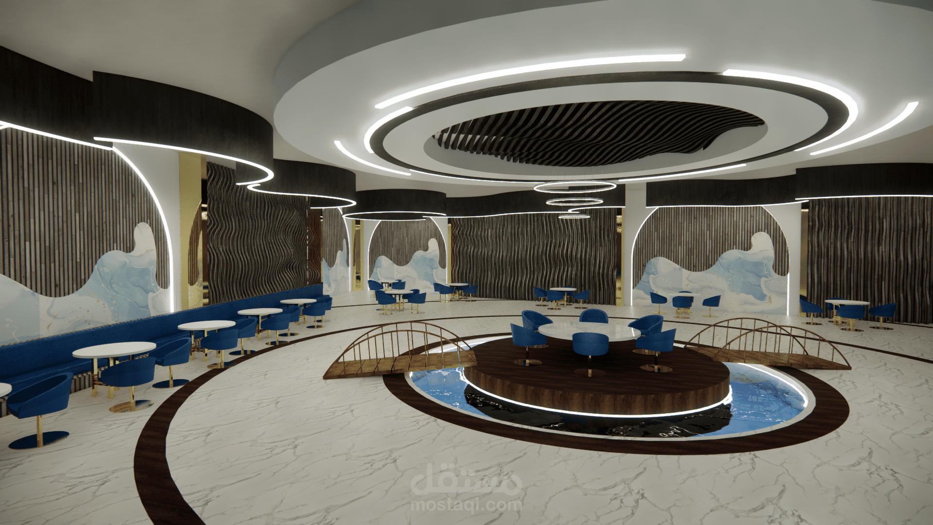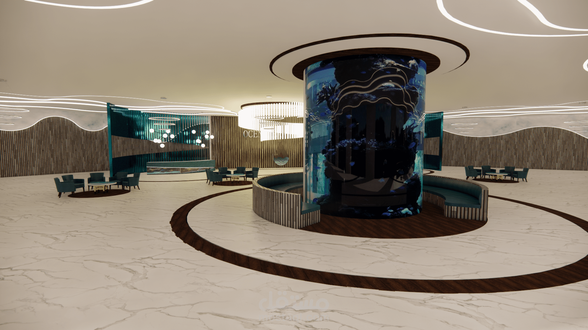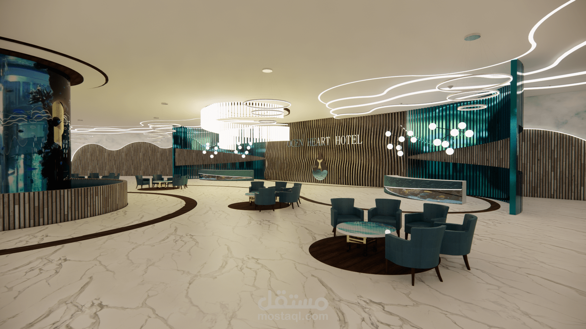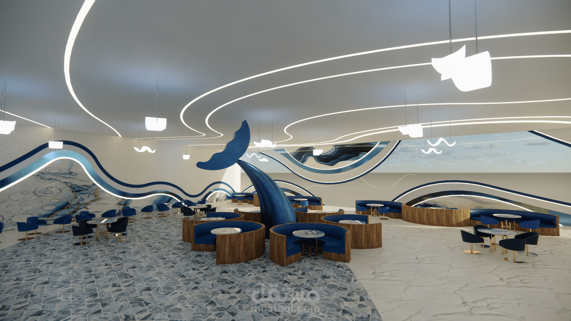الفكرة التصميمية ( concept ) : أمواج البحر ، نوع الطراز المستخدم : البارامتري . ( المشروع تم تصميمه أثناء دراستي في الجامعة وهو غير حقيقي ).