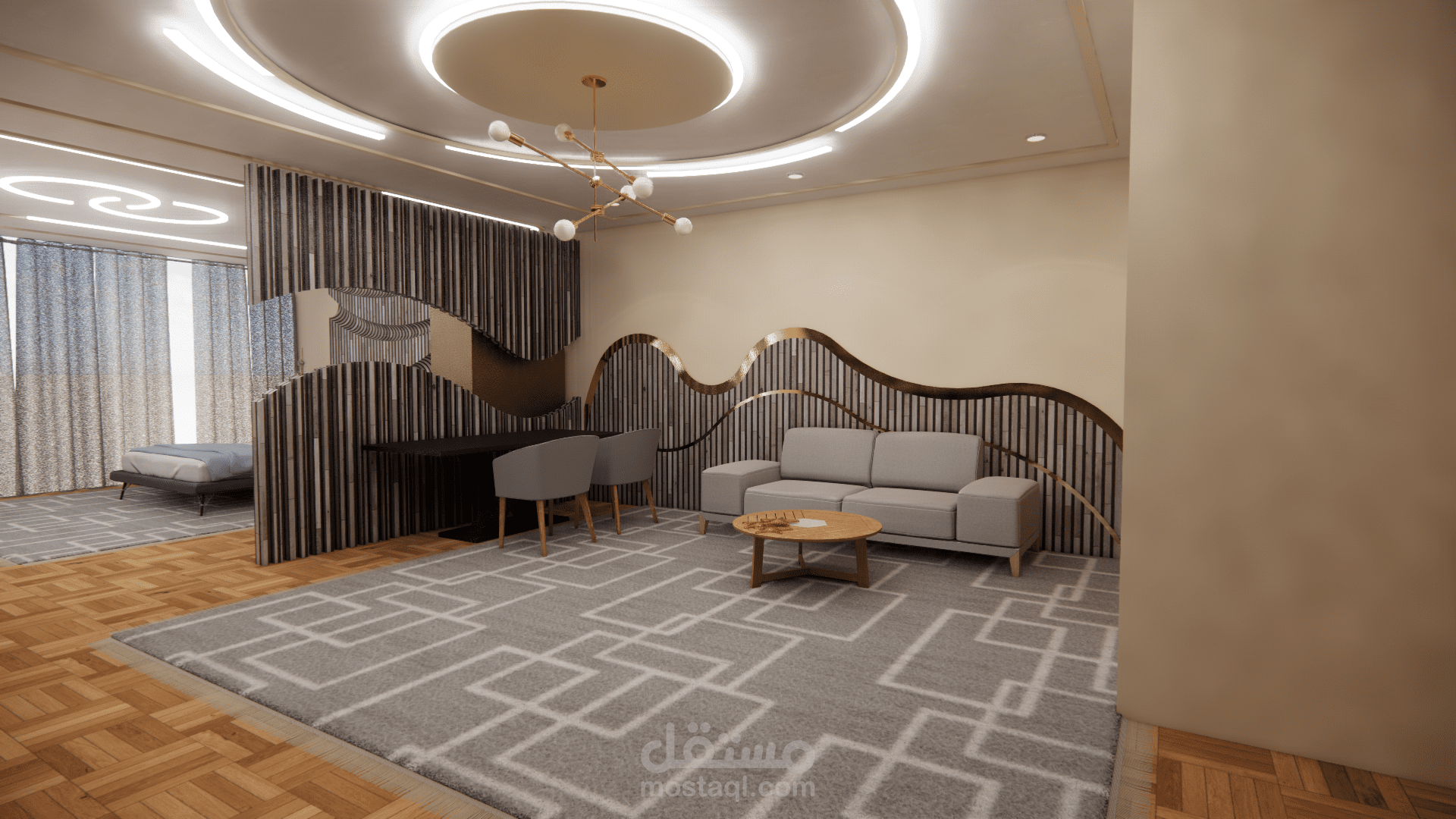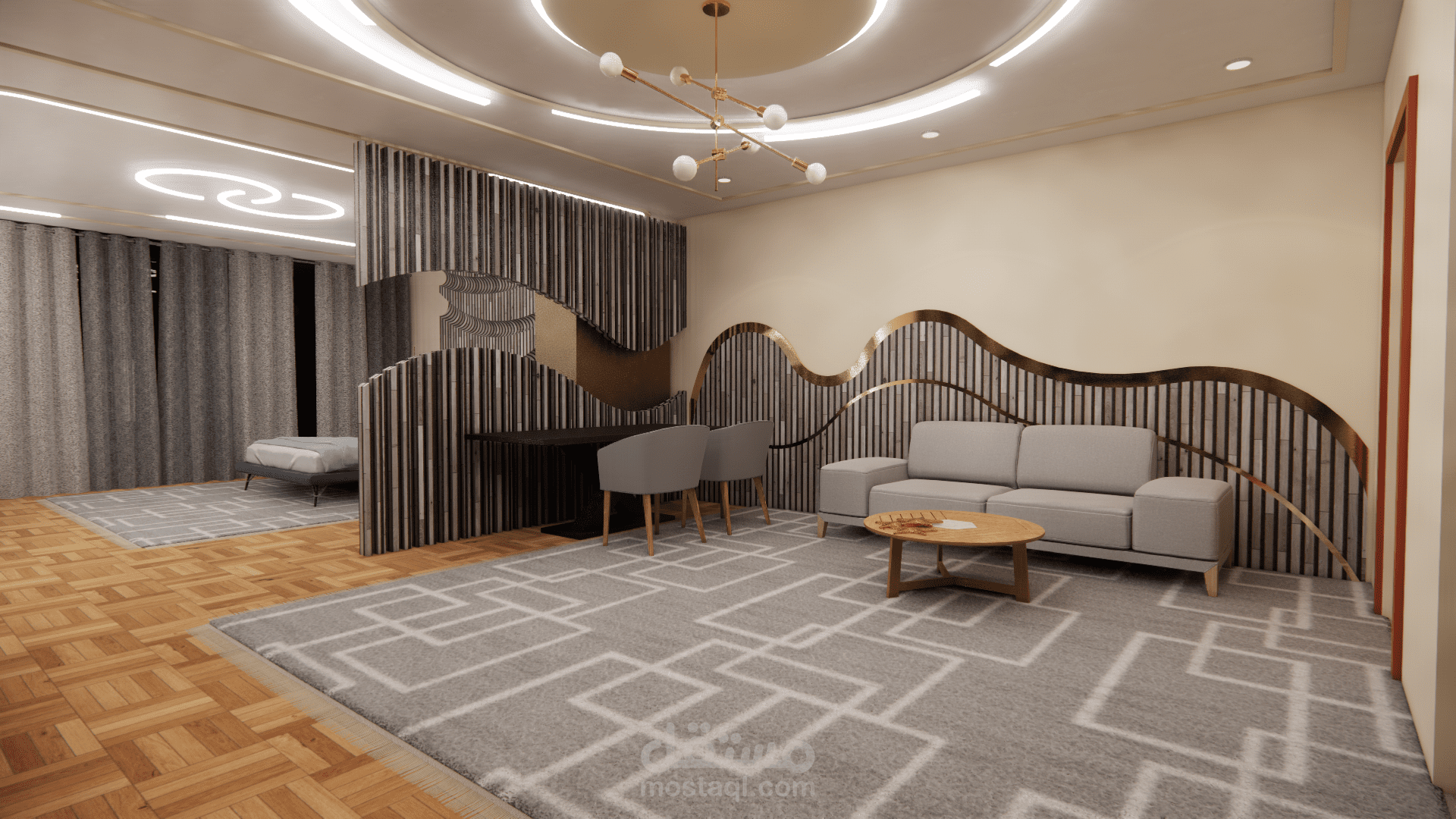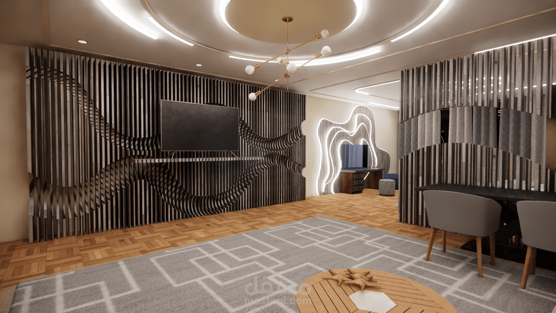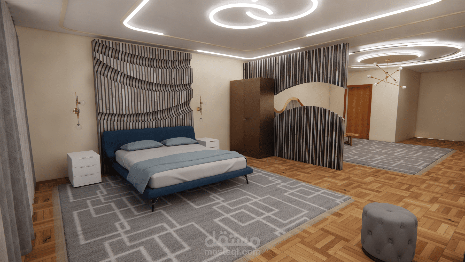 الفكرة التصميمية ( concept ) : أمواج البحر ، نوع الطراز المستخدم : البارامتري . ( المشروع تم تصميمه أثناء دراستي في الجامعة وهو غير حقيقي ).