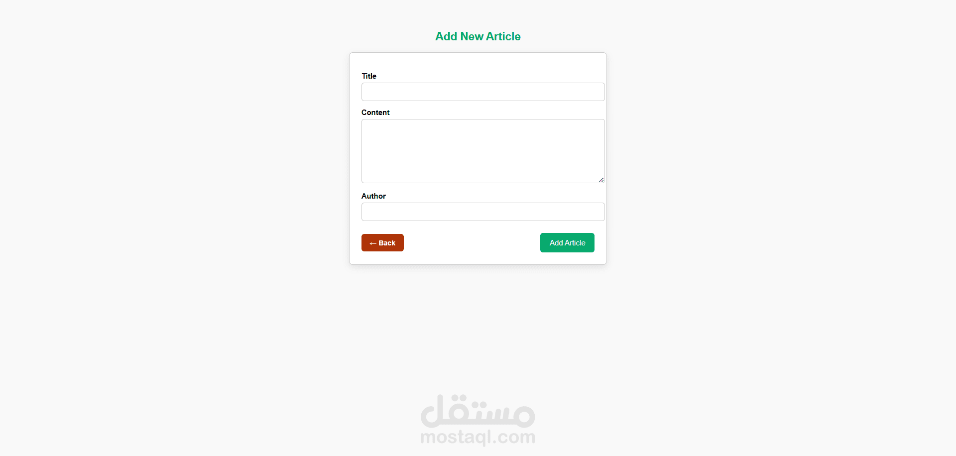 صفحة إضافة مقال جديد تحتوي على نموذج إدخال منسق مع التحقق من البيانات وزر “رجوع” للعودة إلى القائمة.