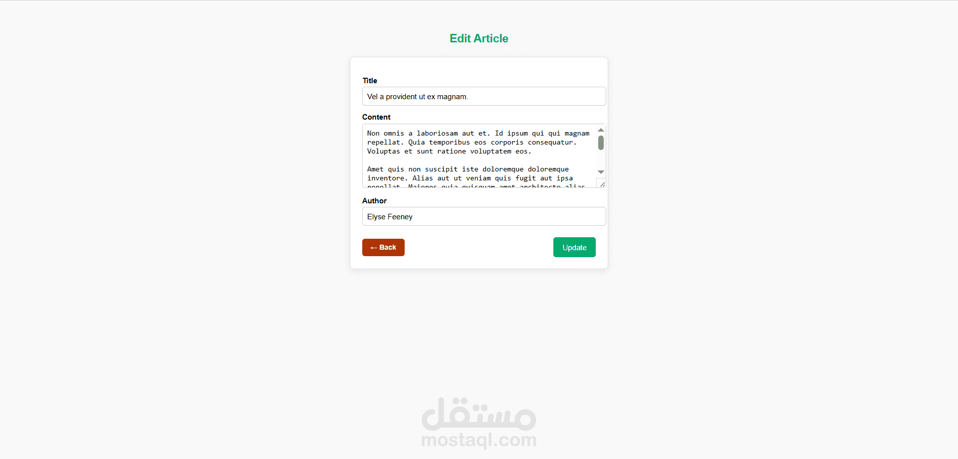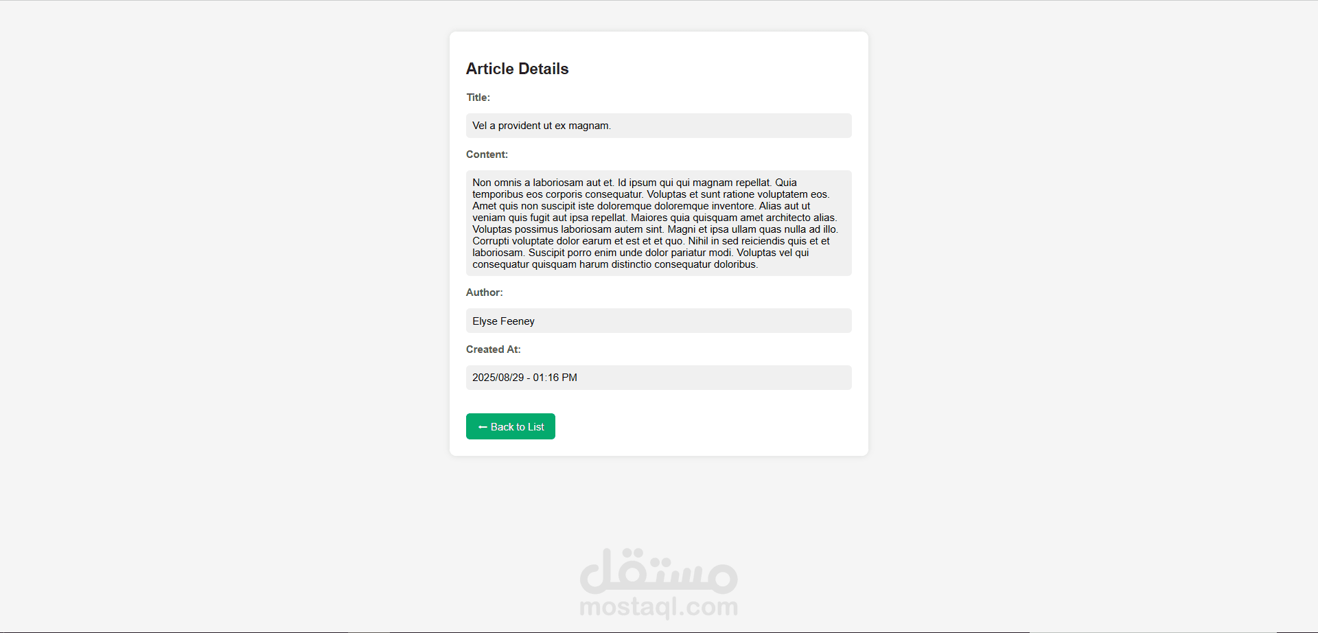 يتيح للمستخدم إمكانية إضافة المقالات الجديدة، تعديلها، عرضها، وحذفها ضمن تصميم منسق يعتمد على البطاقات (Cards).
