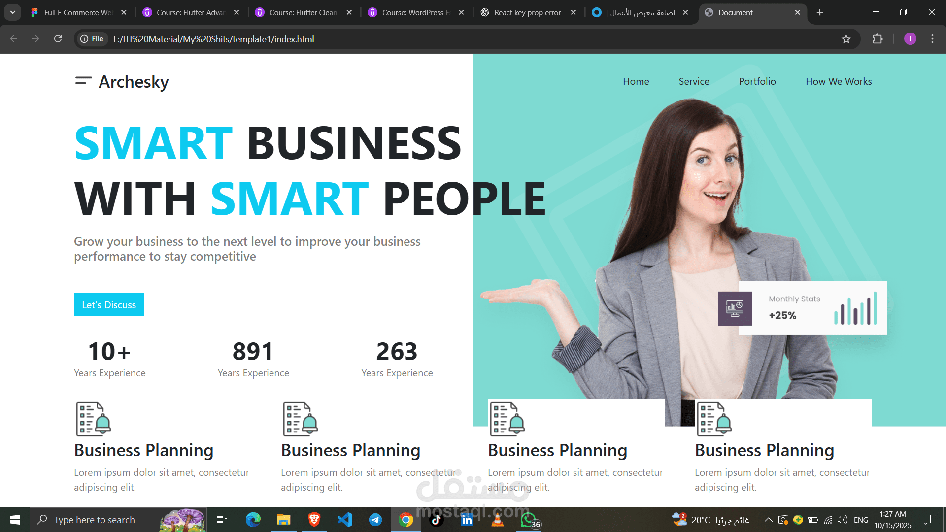 قمت بتصميم وتطوير واجهة موقع أعمال احترافية (Business Template) باستخدام HTML, CSS, و JavaScript، مع تصميم عصري ومتجاوب يناسب جميع الأجهزة.