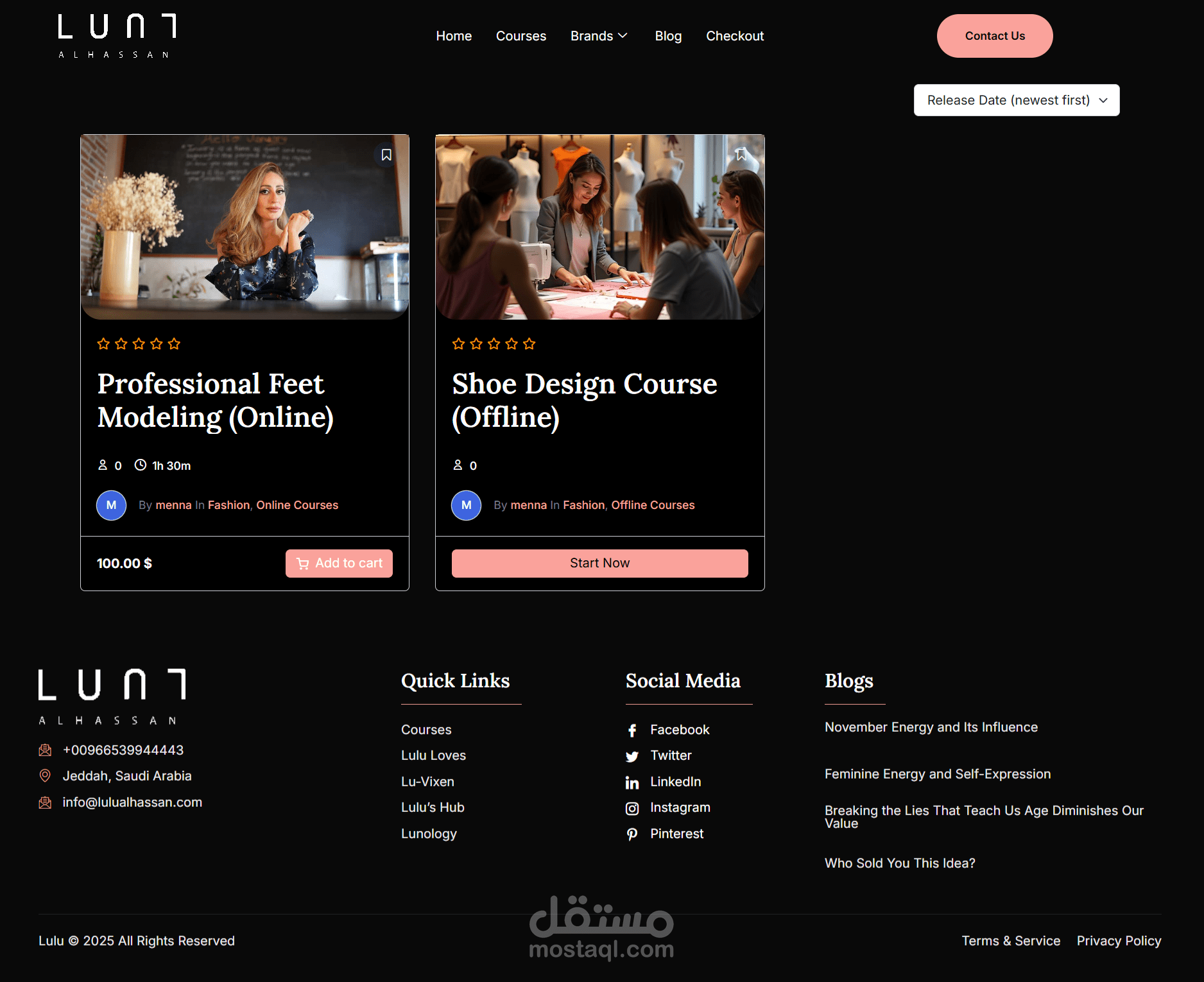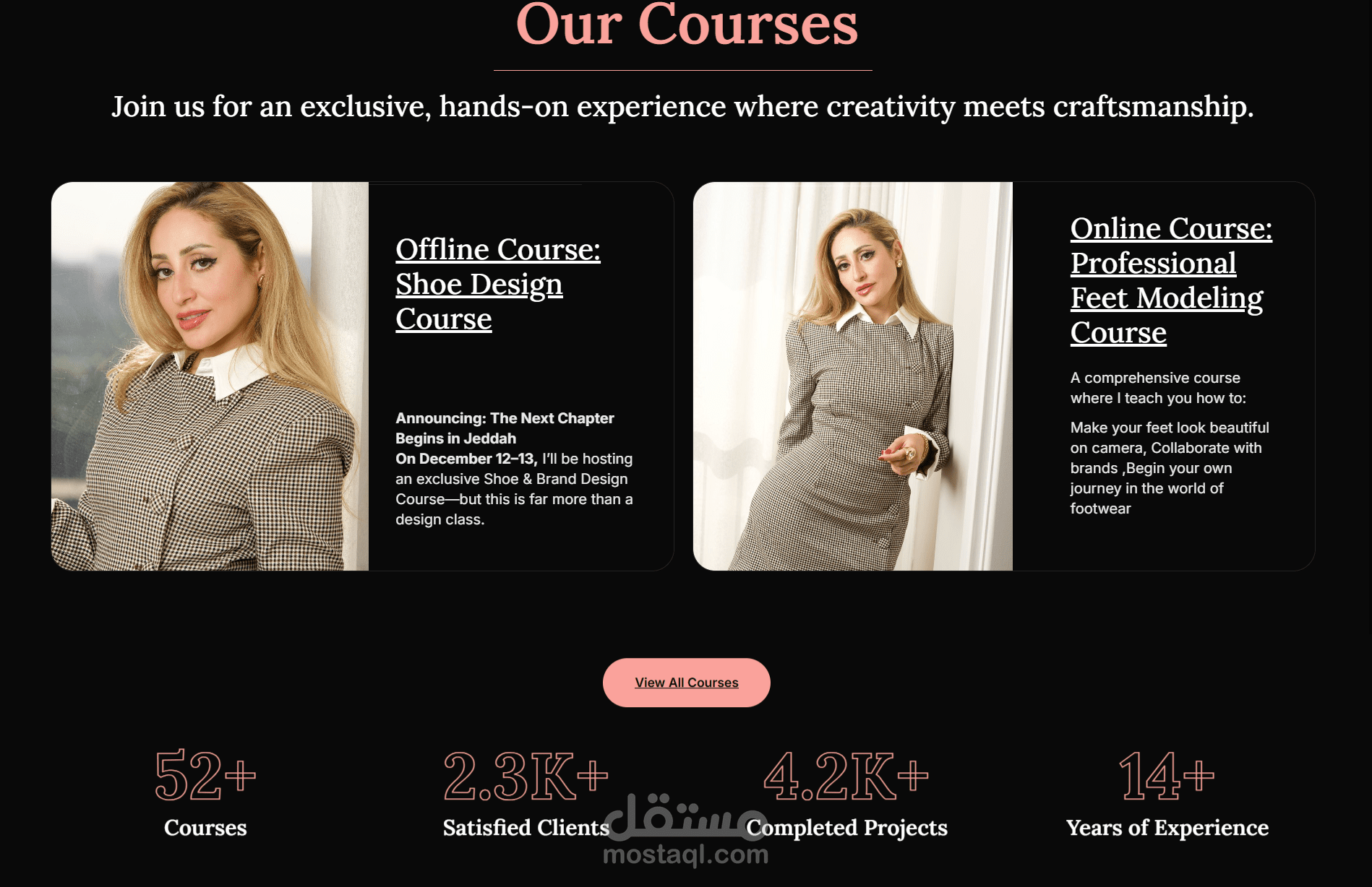 الموقع يعرض نبذة تعريفية عن الشخصية، خبراتها، وإنجازاتها، بالإضافة إلى قسم خاص بالكورسات والدورات التدريبية بشكل منظم وسهل التصفح.