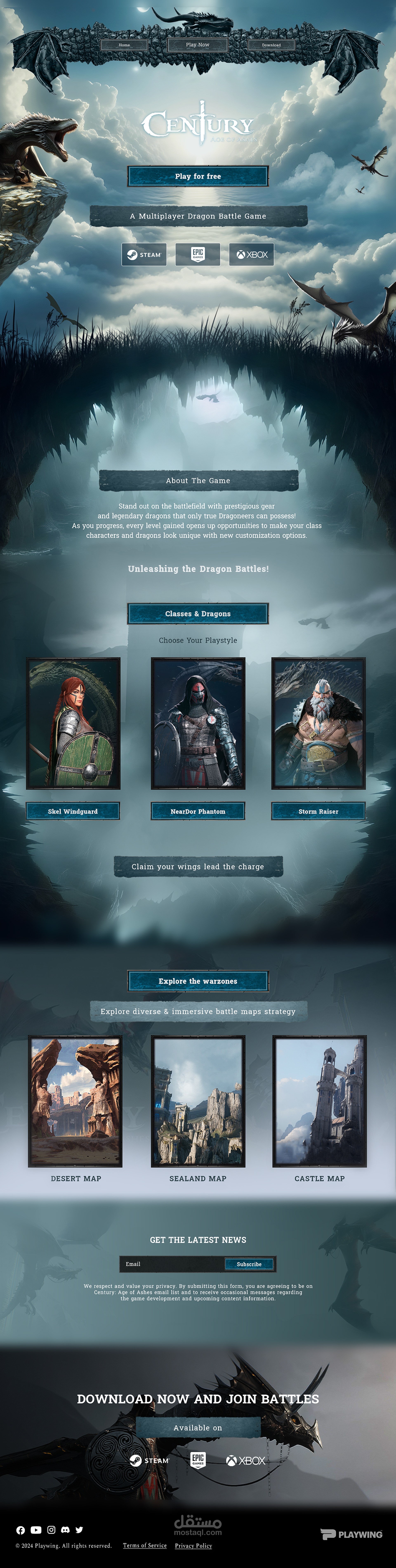 مشروع UI Game Website Concept قمت بتصميمه خصيصًا للعبة Century of Ashes، وهي لعبة Dragon Multiplayer تتميز بالأجواء الحماسية والعالم الخيالي المليء بالتنانين والمعارك الجوية.