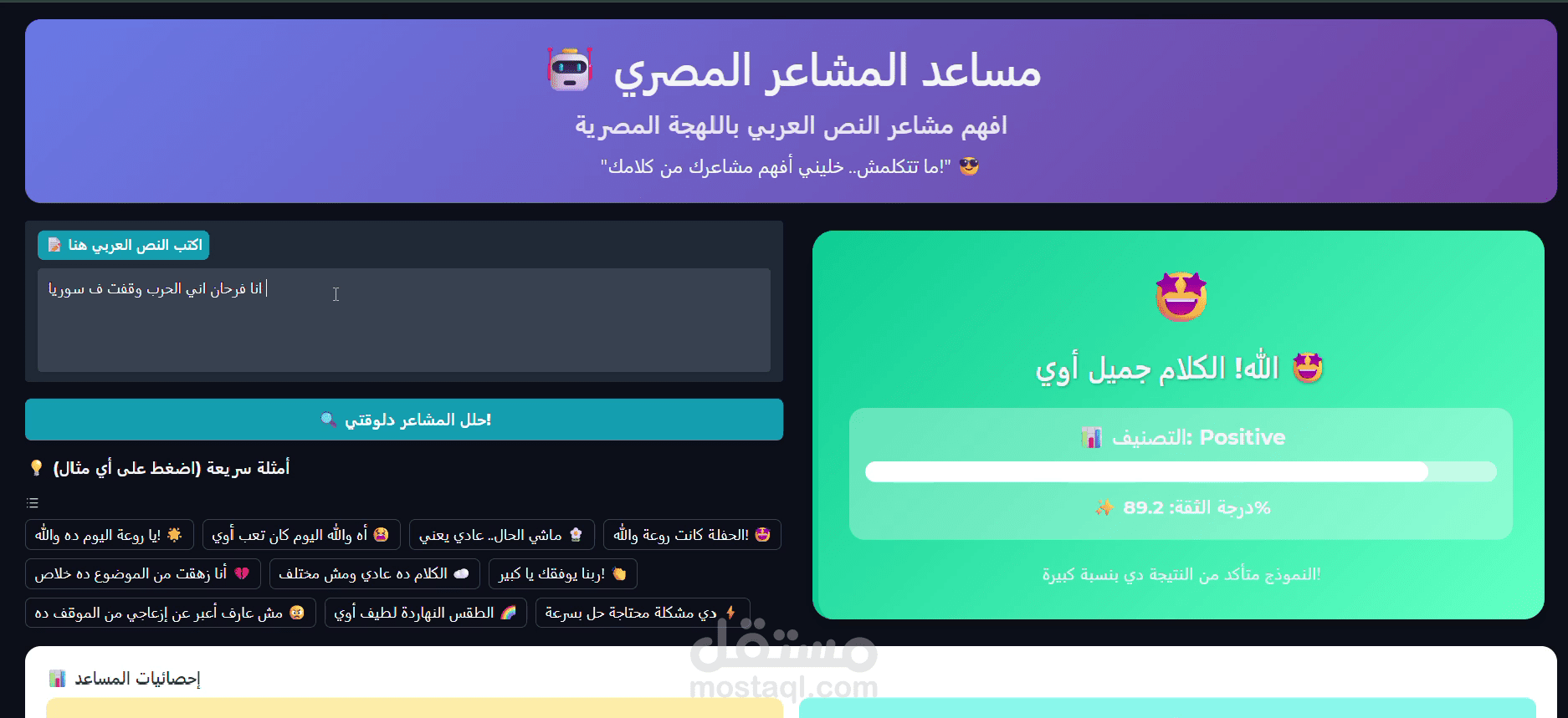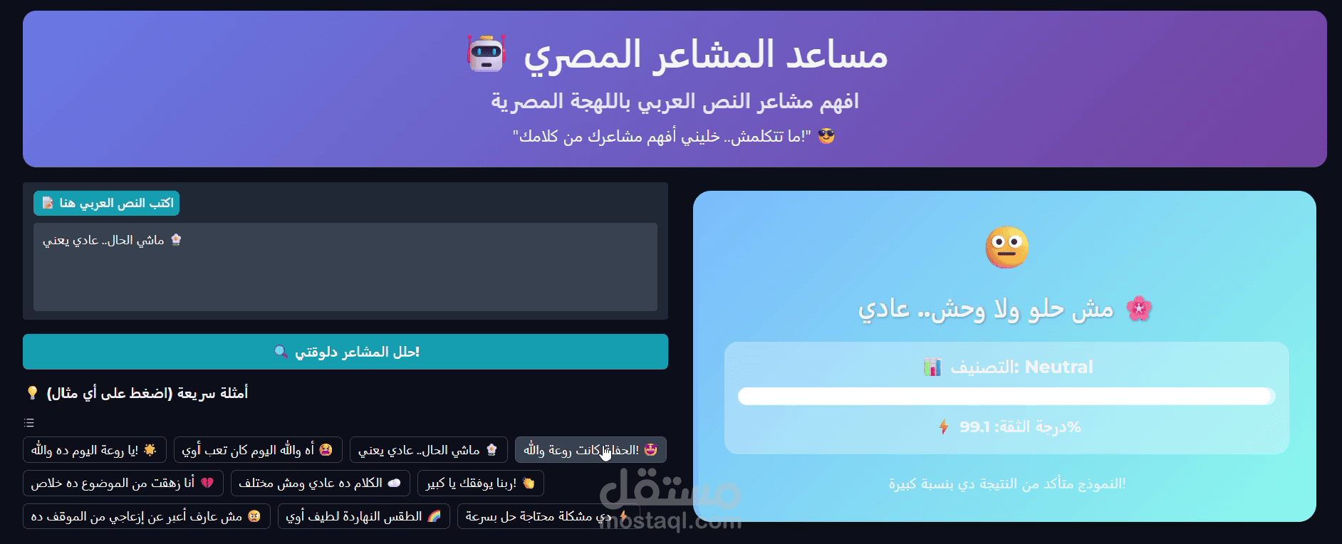 يتعامل مع العامية المصرية، الرموز التعبيرية والهاشتاجات بدقة عملية للحصول على نتائج مفهومة وقابلة للاعتماد.