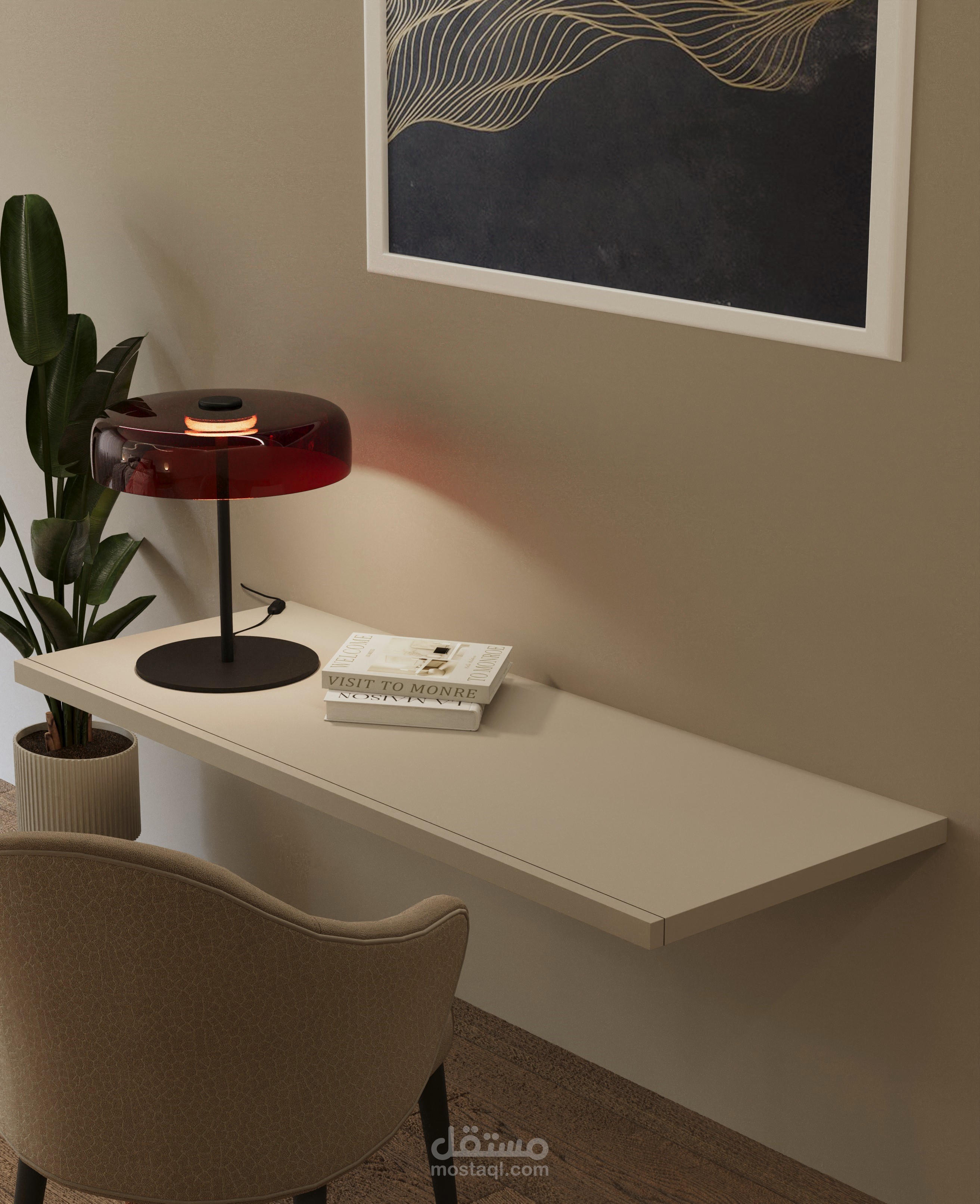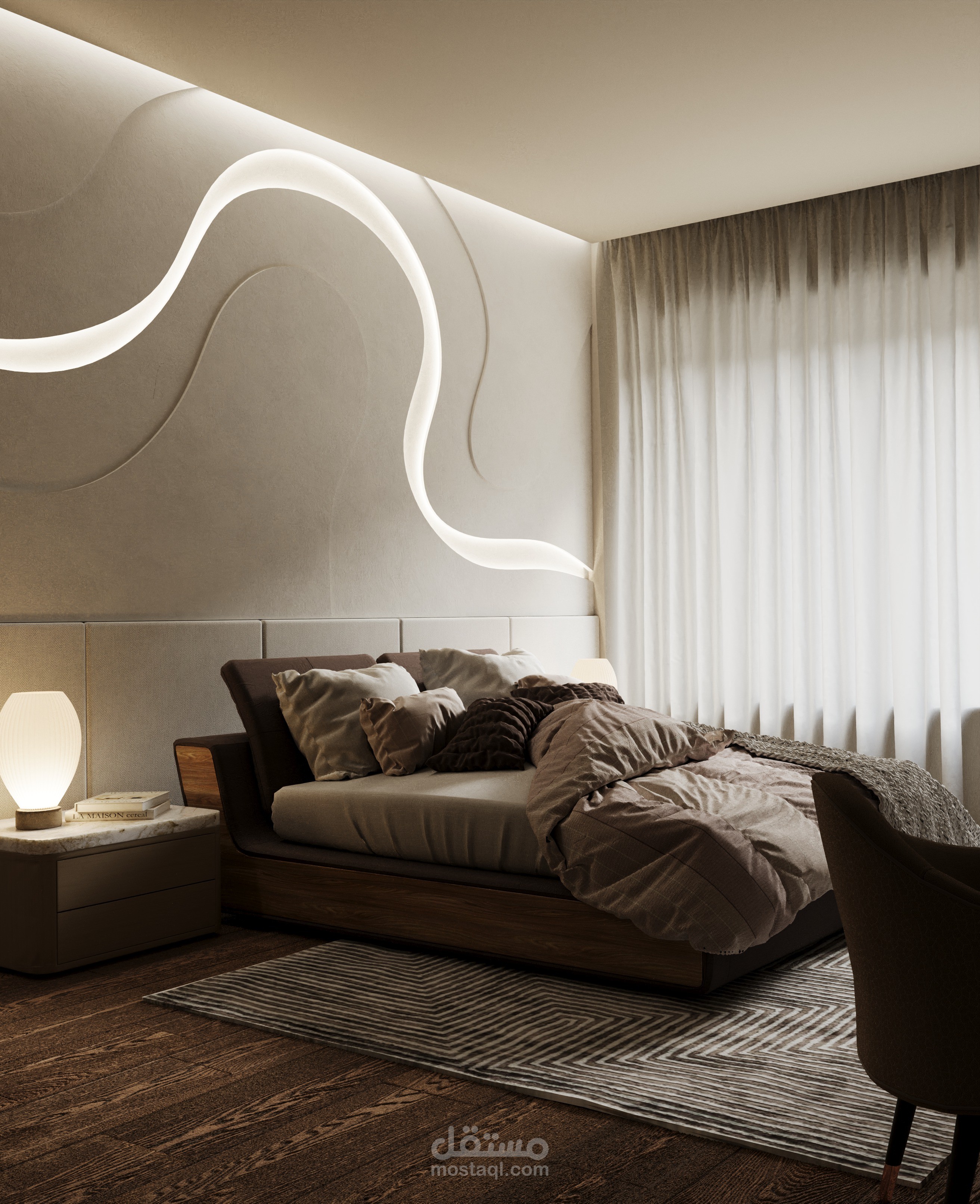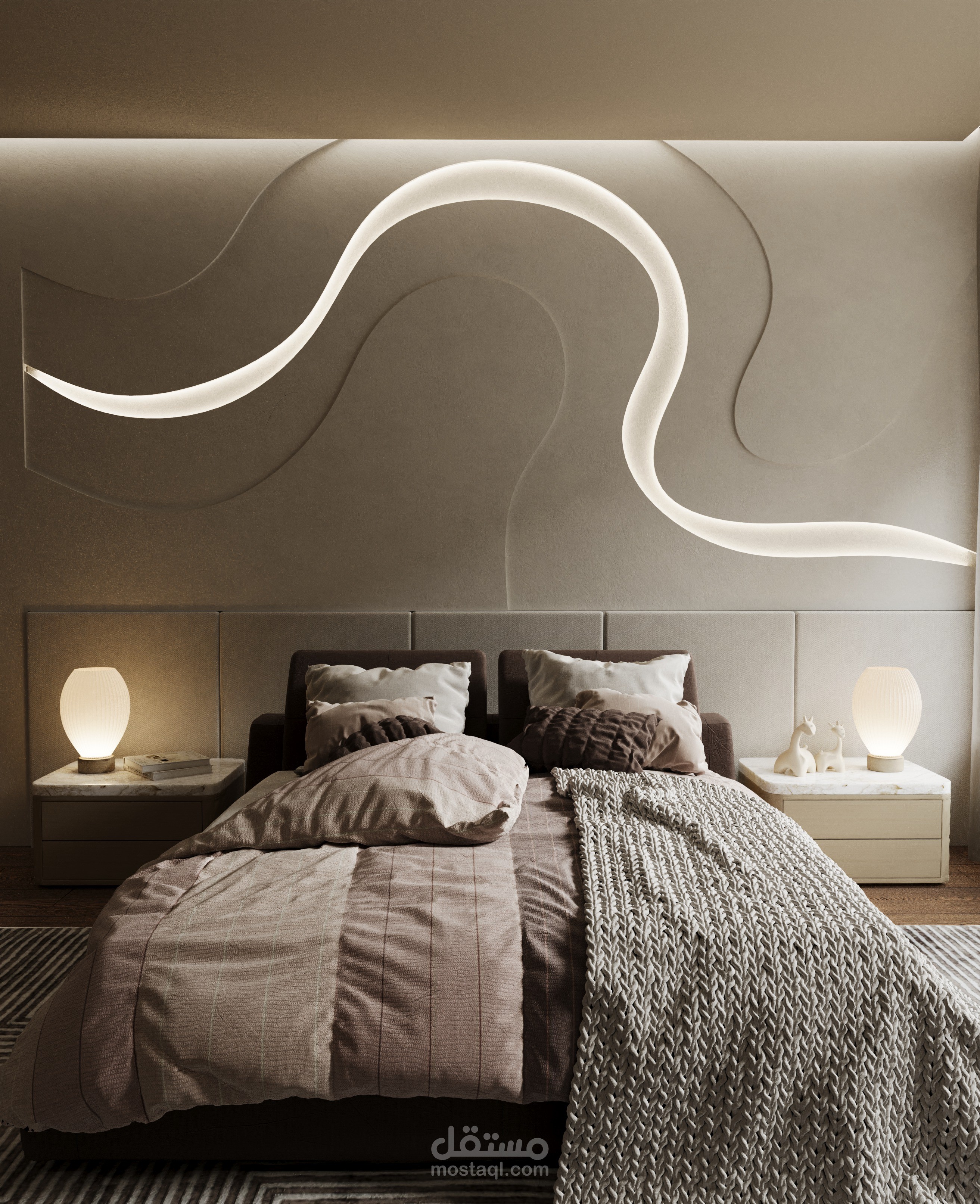 A cozy bedroom designed with warm colors and soft lighting for a peaceful vibe.