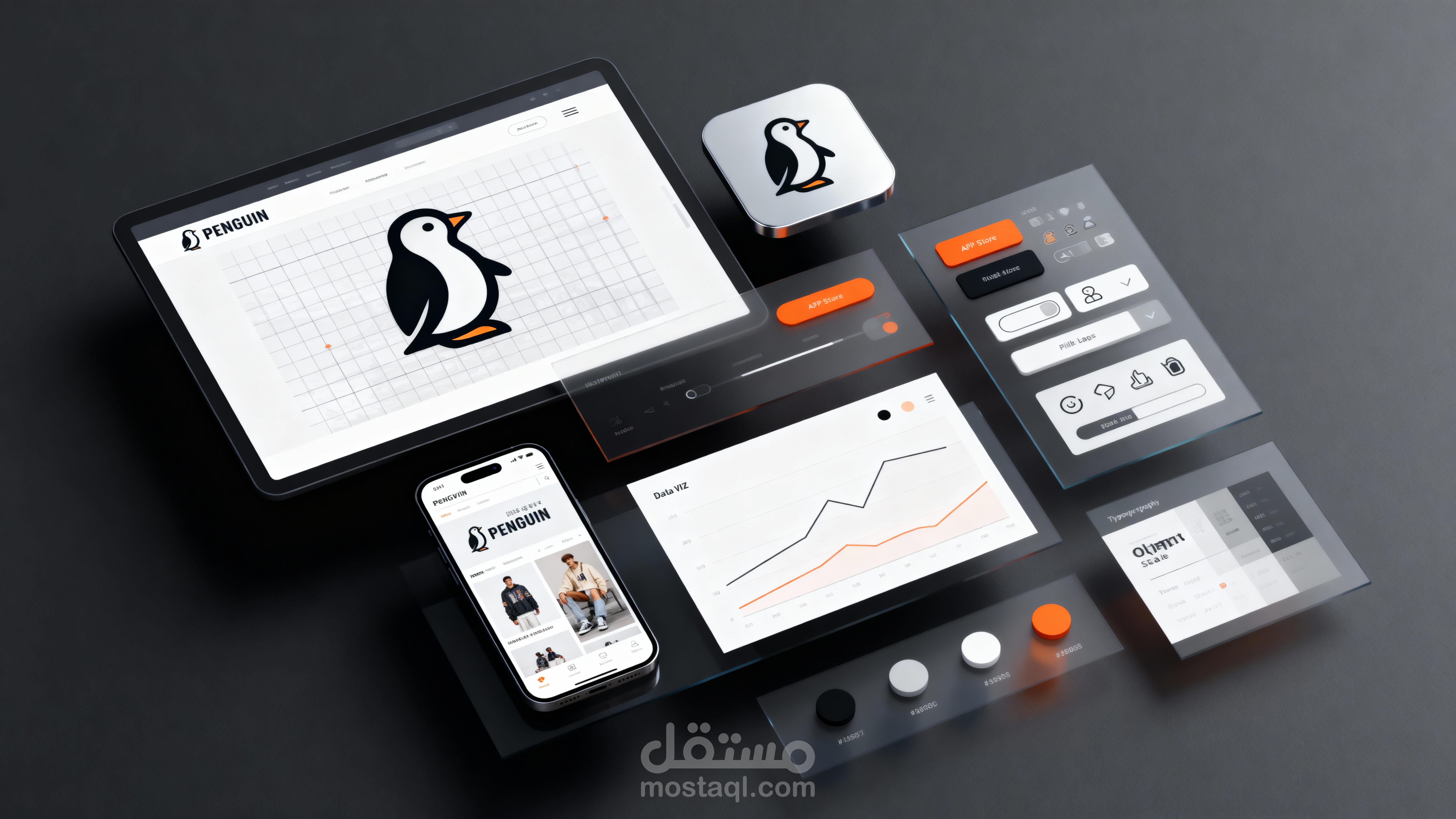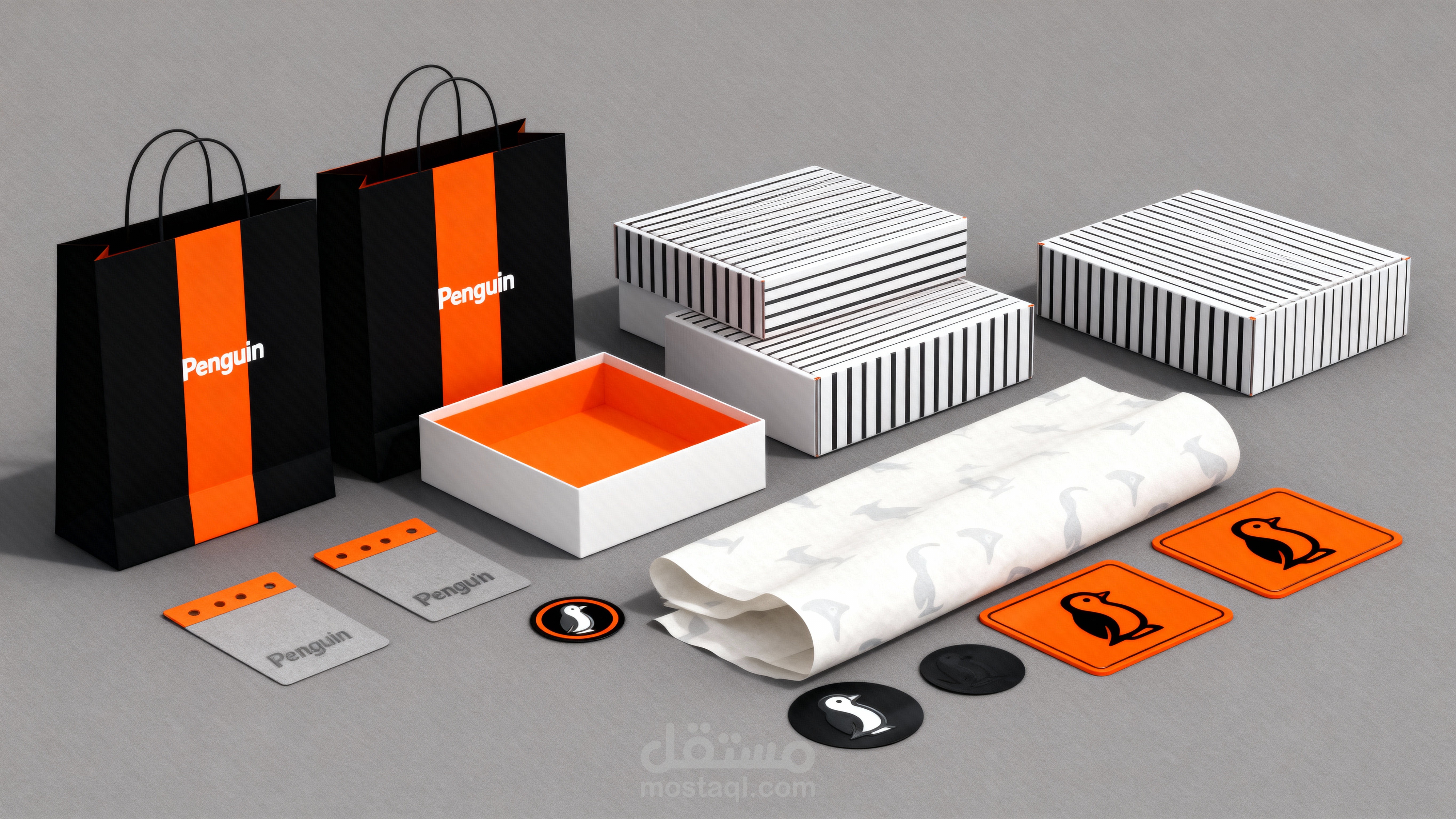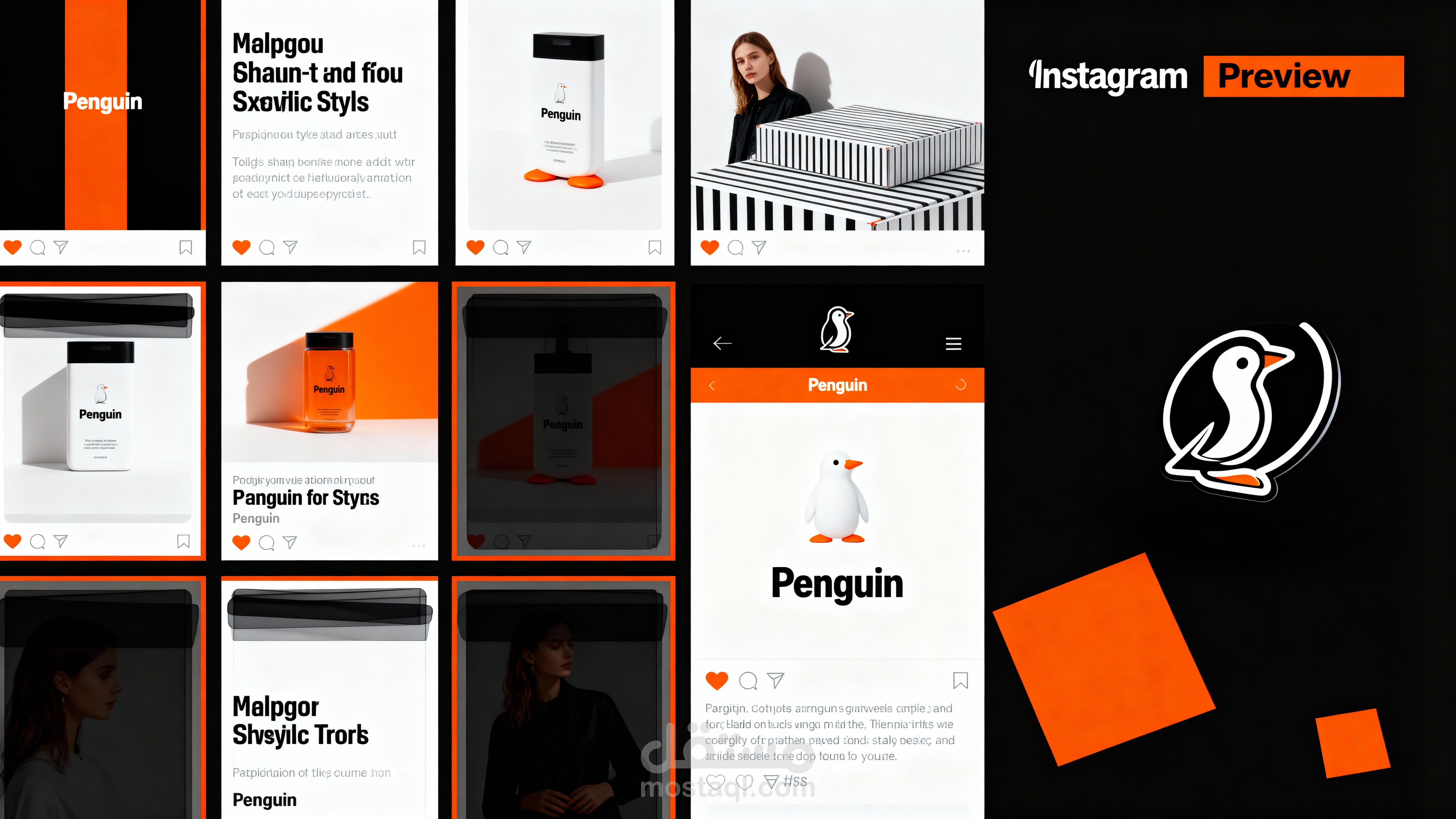 السوشيال ميديا: محتوى نظيف بخلفيات رمادية أو بيچ، مع لمسات برتقالية للفت الانتباه.
