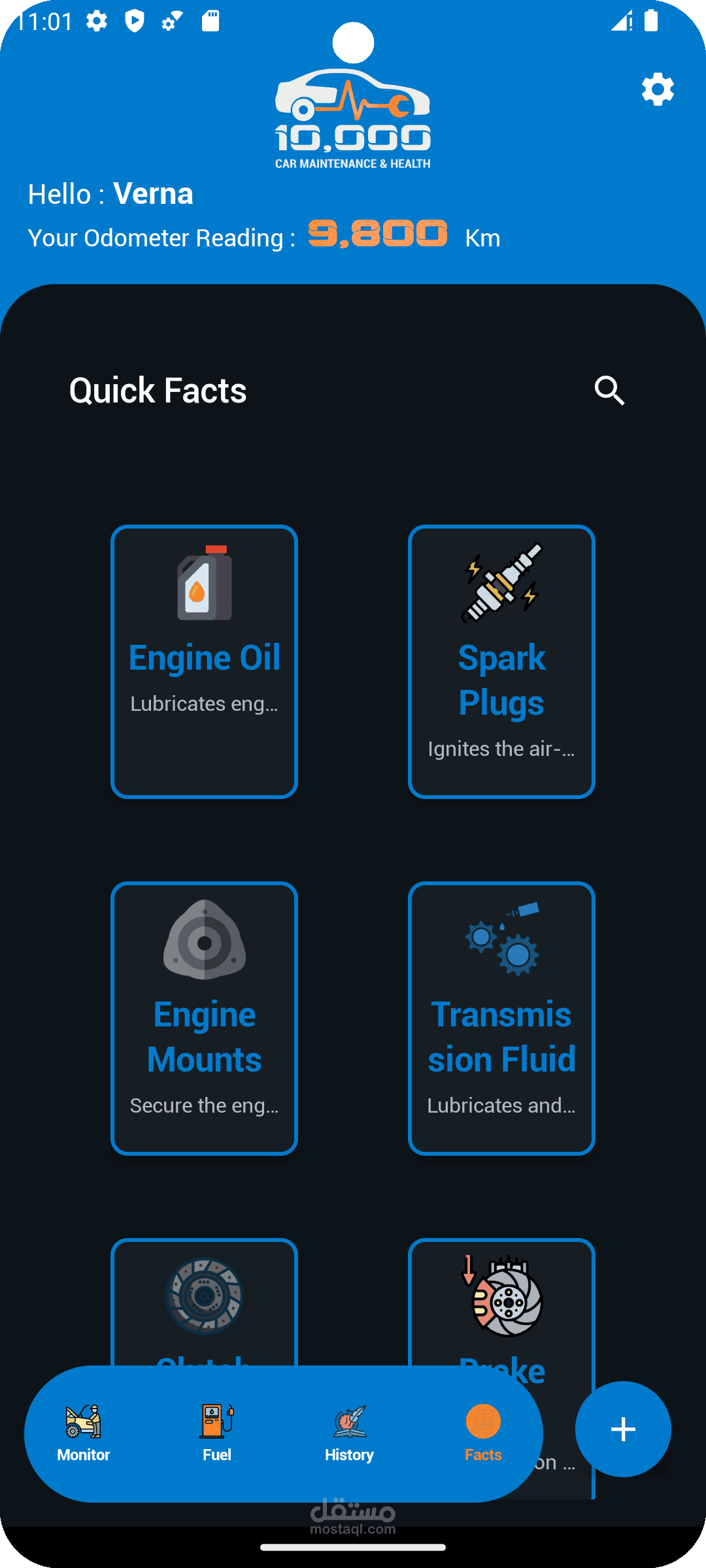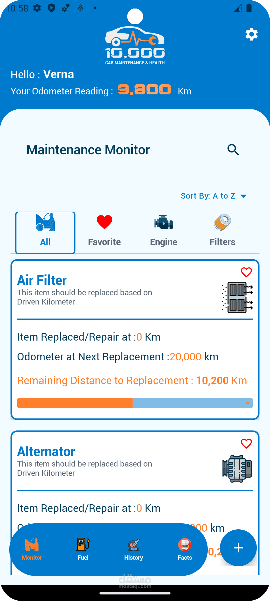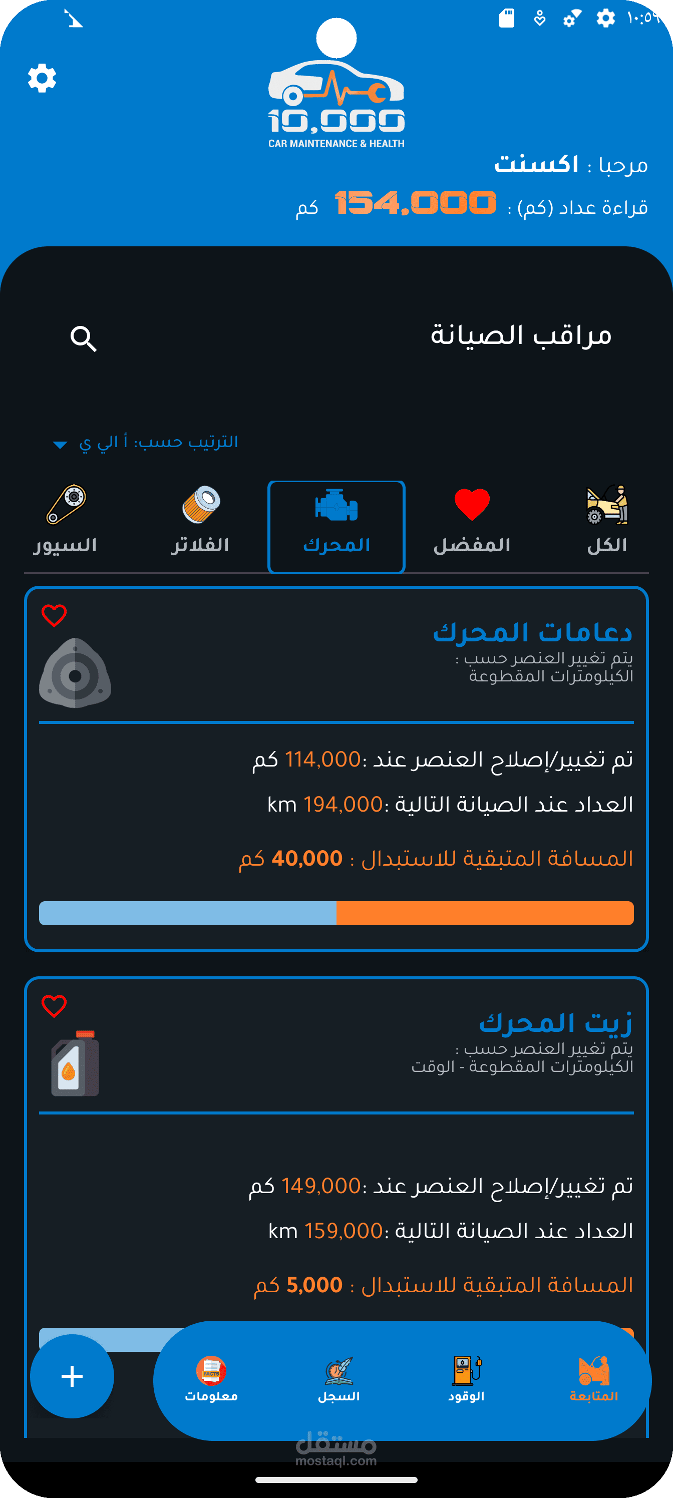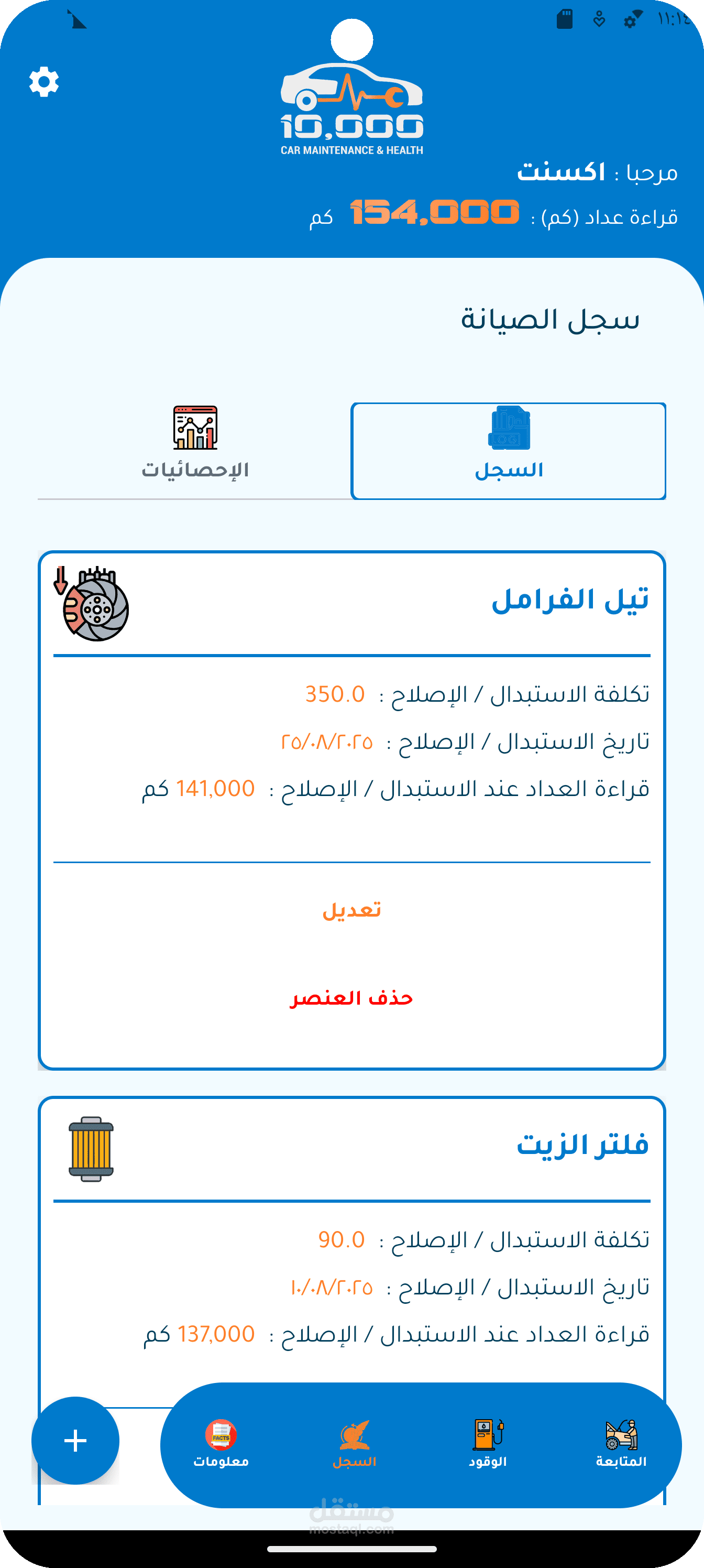 التطبيق بيقدّم نظام كامل لتسجيل الصيانات، تنبيهات حسب الوقت أو الكيلومترات، وتحليلات بصرية بتوضح أعلى قطع تكلفة وأقرب الصيانات القادمة.