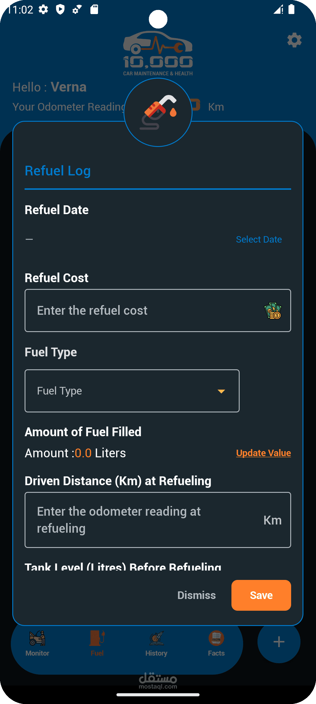 كمان بيوفر متتبع وقود لحساب الكفاءة والتكلفة وتحليل الأداء الشهري، مع واجهة تفاعلية مبنية بالكامل باستخدام Jetpack Compose و Lottie Animations لتجربة سلسة وجذّابة.