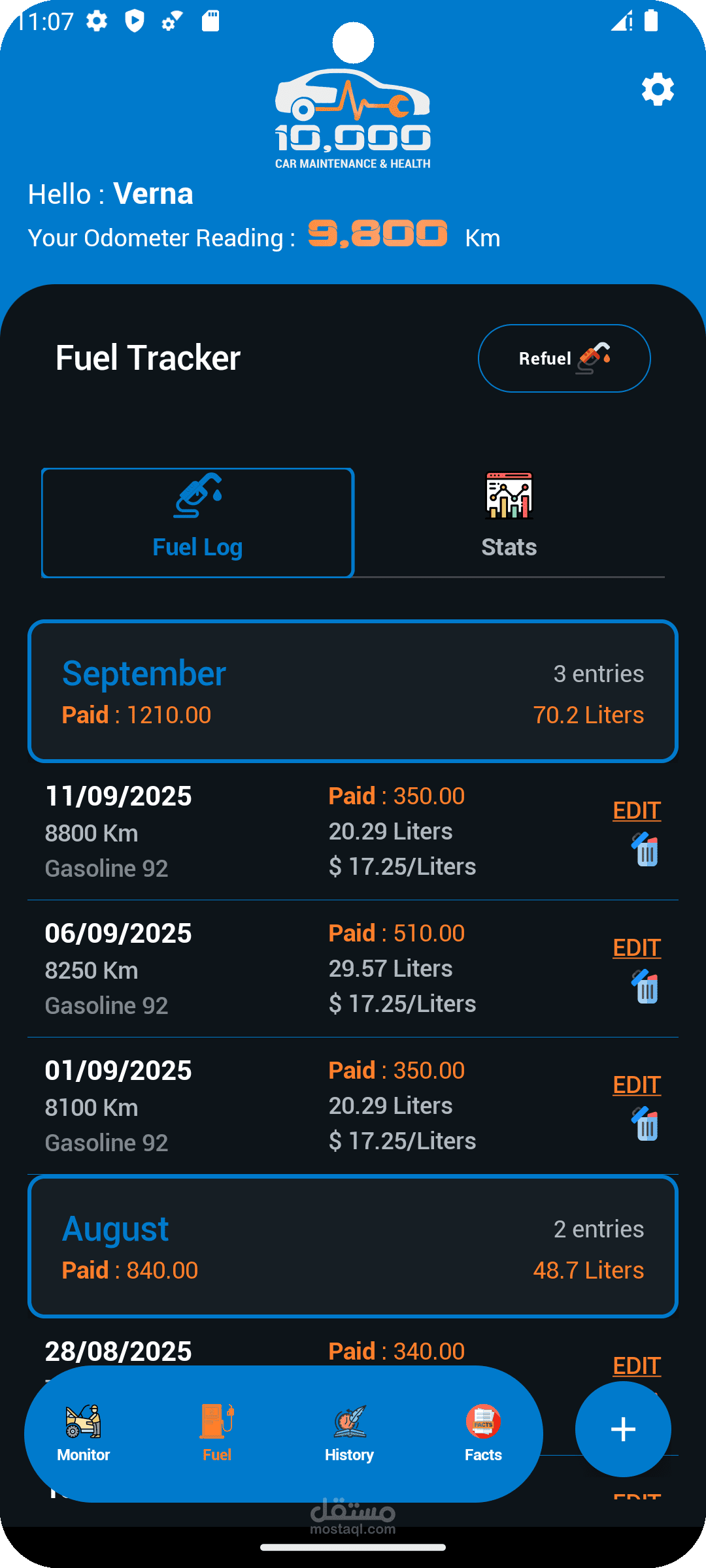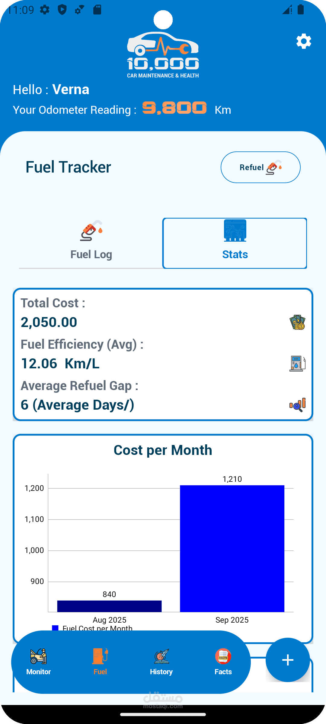 It also provides a fuel tracker with automatic efficiency calculations, cost analysis, and monthly performance charts.