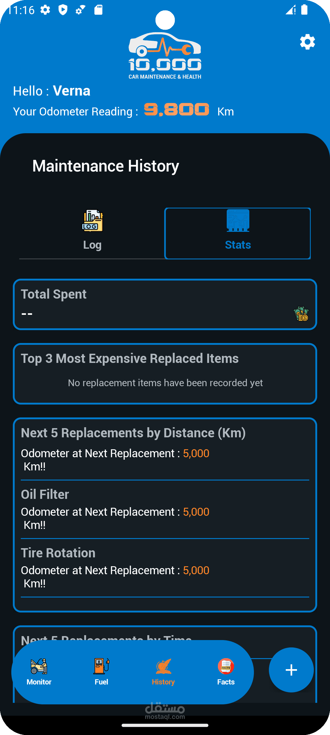 Users can record service details (oil, filters, spark plugs, etc.), set reminders based on time or mileage, and monitor expenses with insightful statistics like “Top 3 Most Expensive Replacements” and “Next 5 Items Due.”
