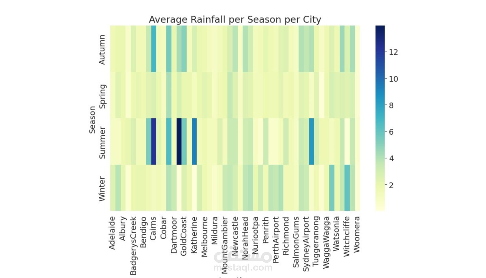 اعتمدت على بيانات تشمل درجات الحرارة، الرطوبة، سرعة الرياح، وكميات الأمطار في مدن متعددة داخل أستراليا، وقمت بمعالجتها واستخراج مؤشرات تساعد في اتخاذ قرارات دقيقة.