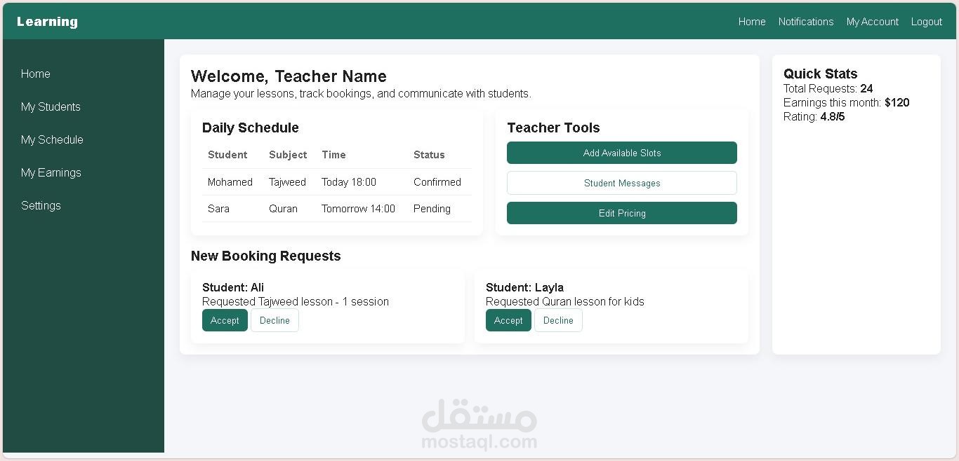 الداش بورد مناسبة للمواقع التعليمية، أو المنصات الإدارية، أو التطبيقات التفاعلية التي تحتاج إلى عرض بيانات المستخدمين أو إدارة المحتوى بشكل واضح وسلس.