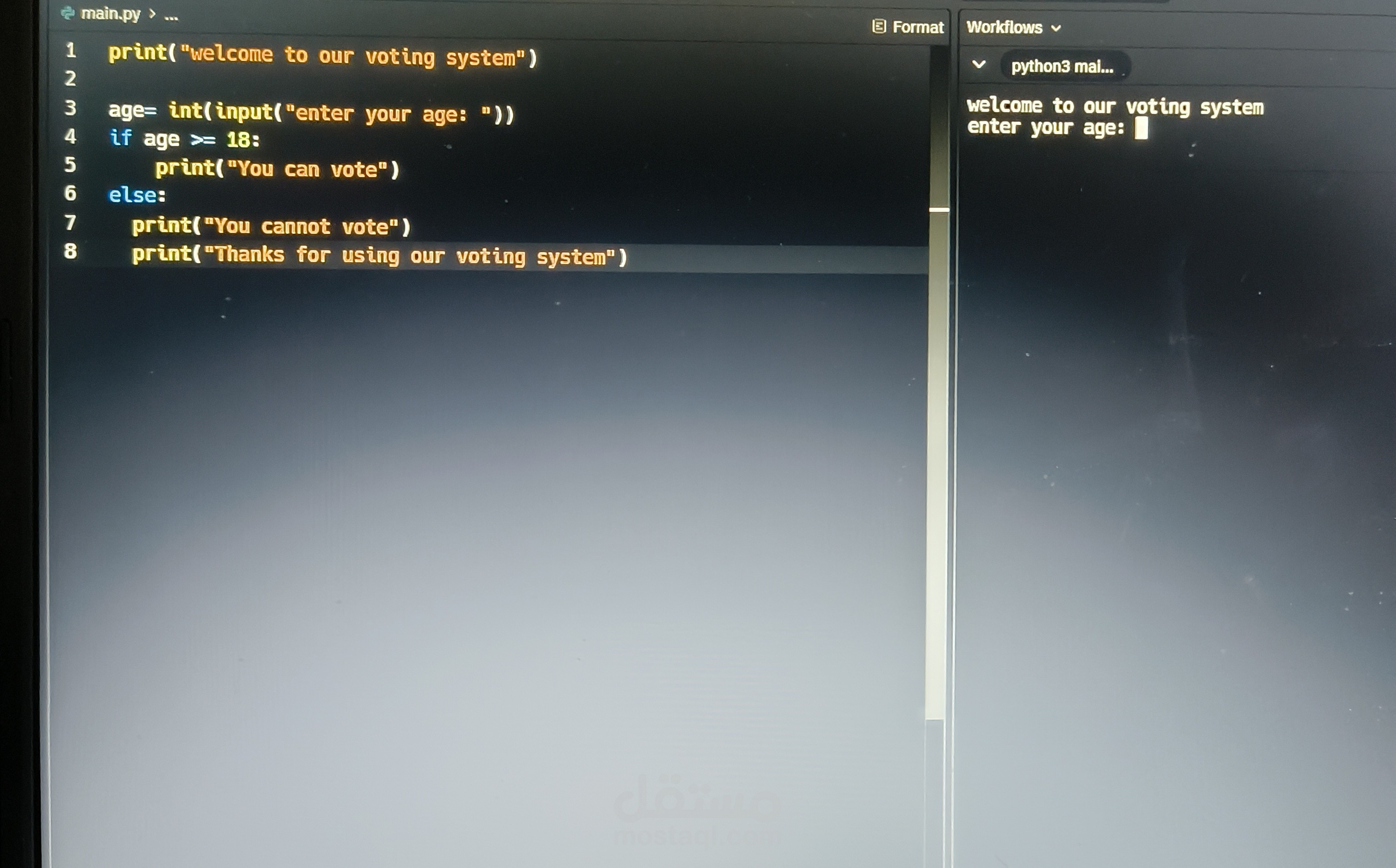 مشروع صغير بلغة Python يتيح للمستخدم إدخال عمره لتحديد ما إذا كان مؤهلًا للتصويت أم لا.