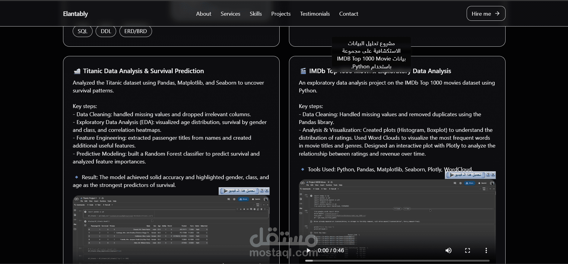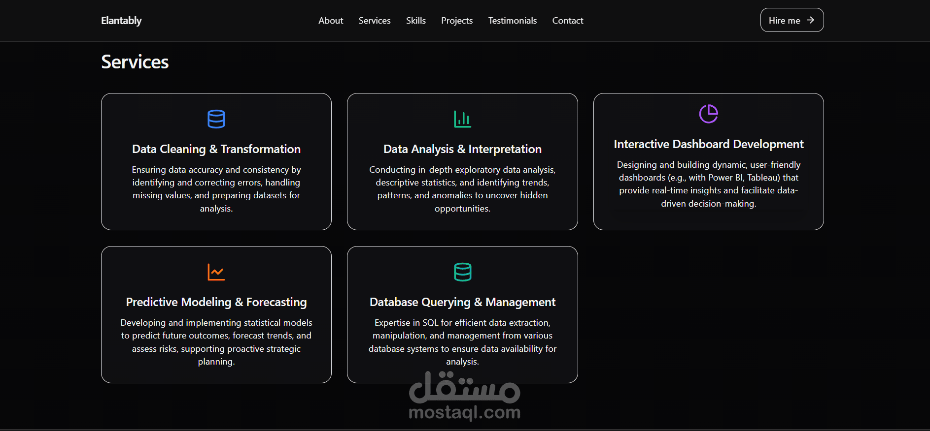 بنيت موقع بورتفوليو تفاعلي لعرض مهاراتي ومشاريعي في تحليل البيانات وBusiness Intelligence. الموقع مصمَّم ليقدّم تجربة مستخدم نظيفة وسريعة، ويجمع بين عرض السيرة الذاتية، الخدمات، المهارات، أمثلة المشاريع (صور + فيديوهات) وروابط مباشرة لتحميل السيرة الذاتية والتواصل عبر LinkedIn وWhatsApp.
