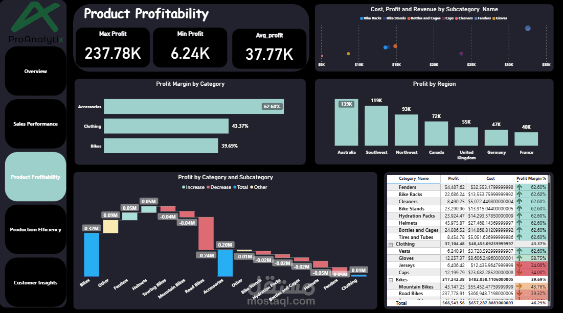 تحليل المنتجات والأقاليم: تحديد المنتجات الأعلى إيراداً (مثل Road Bikes) والأقاليم الأكثر ربحية (مثل أستراليا).