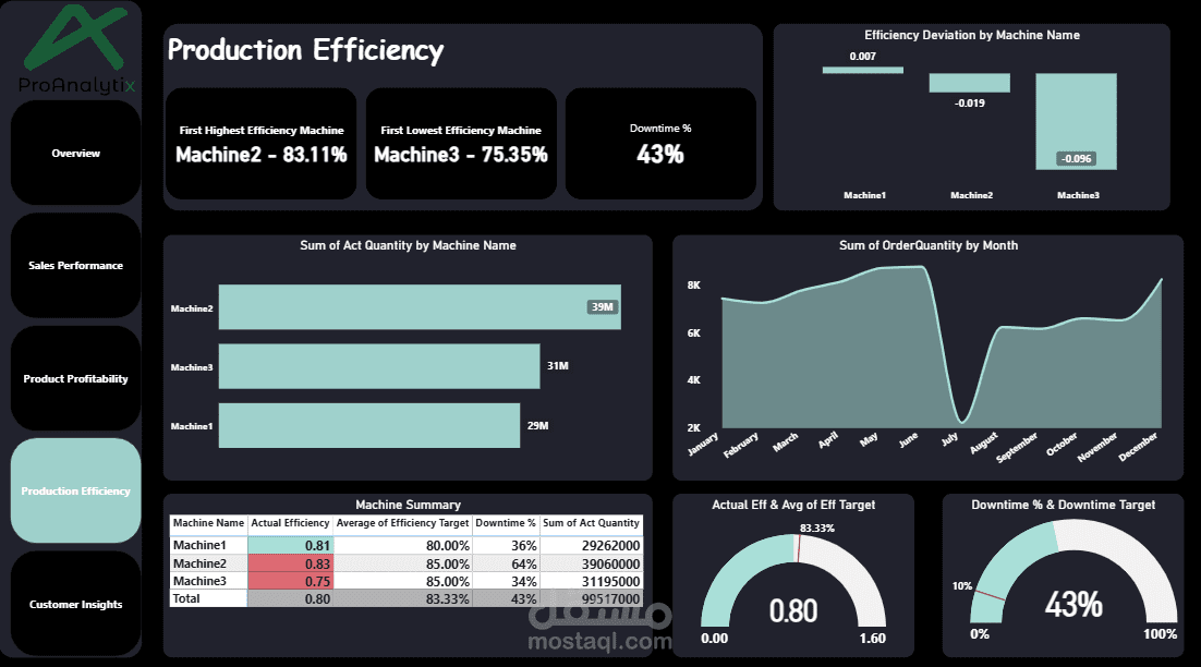 أداء الآلات: تقييم كفاءة كل آلة (Machine2 بأعلى كفاءة 83.11%، وMachine3 بأدنى كفاءة 75.35%) لتحديد أولويات الصيانة والتحسين.
