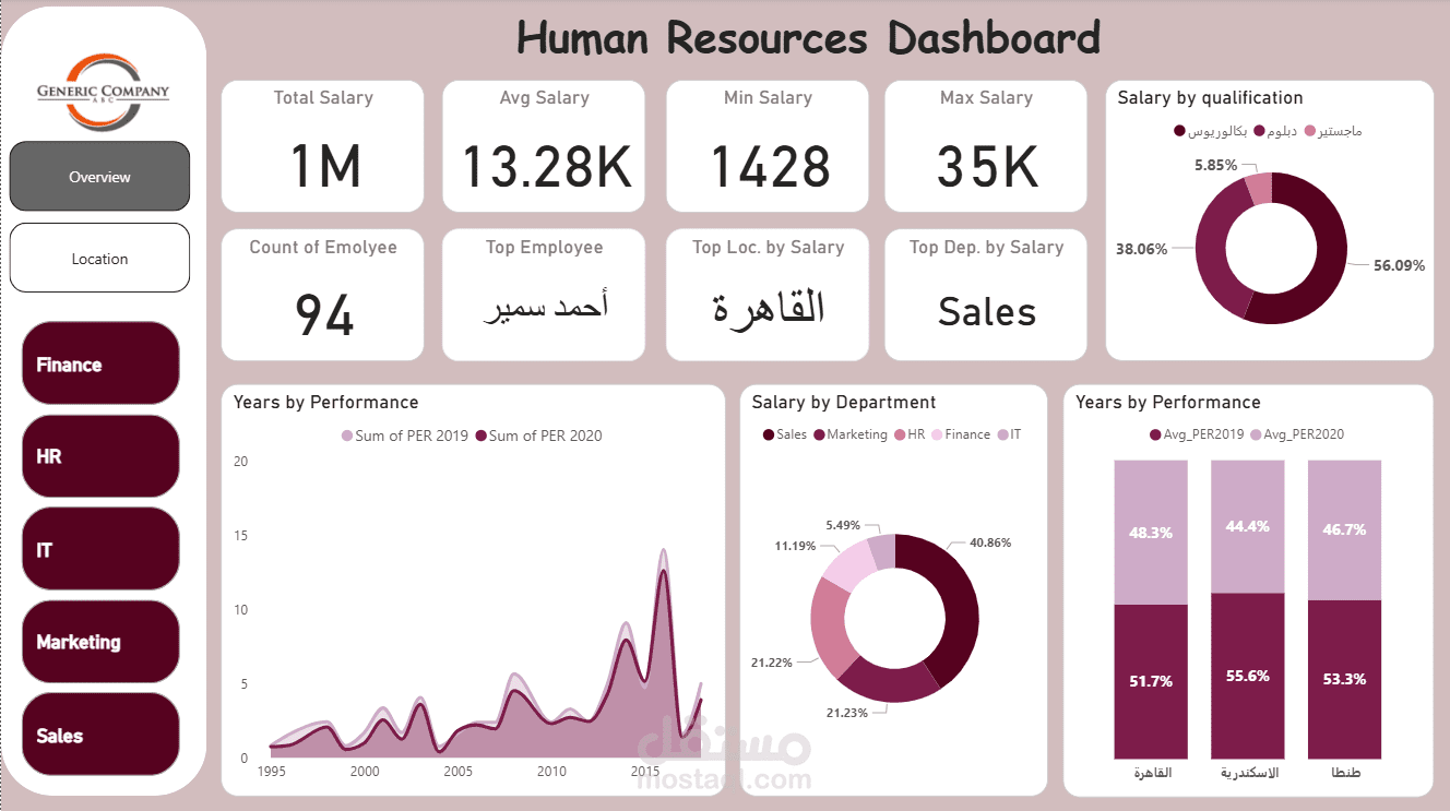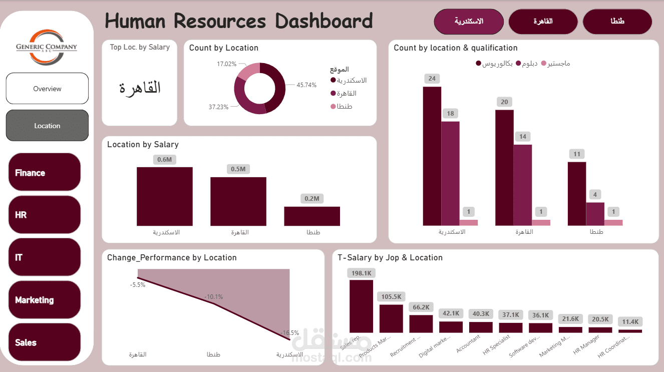 تمثل لوحة المعلومات هذه عرضاً شاملاً وتحليلياً لأهم مؤشرات أداء الموارد البشرية في الشركة، حيث توفر رؤى قيمة وسريعة لصناع القرار من خلال مجموعة من الرسوم البيانية والمقاييس الرئيسية. تنقسم لوحة المعلومات إلى قسمين رئيسيين: نظرة عامة (Overview) وتحليل حسب الموقع (Location).