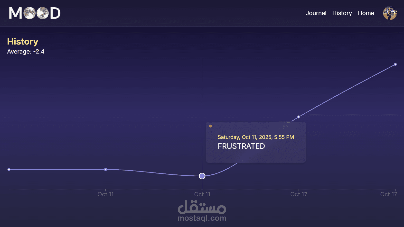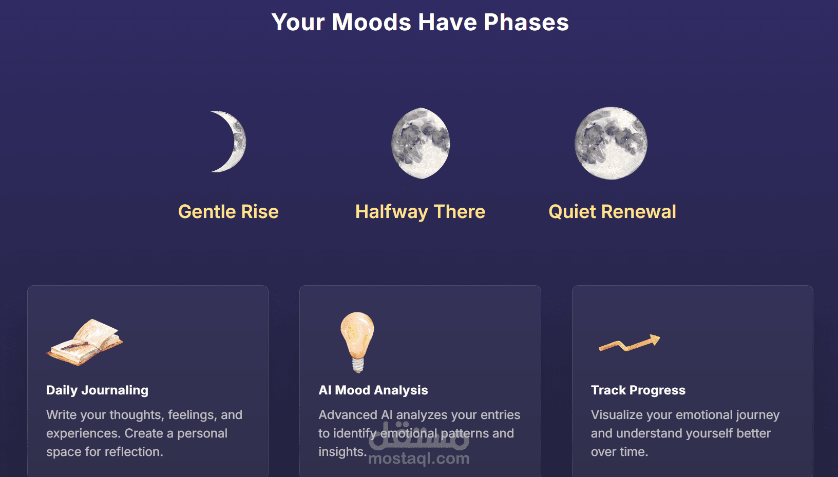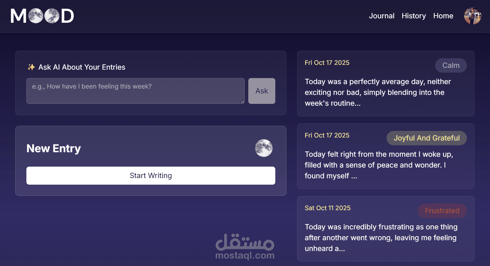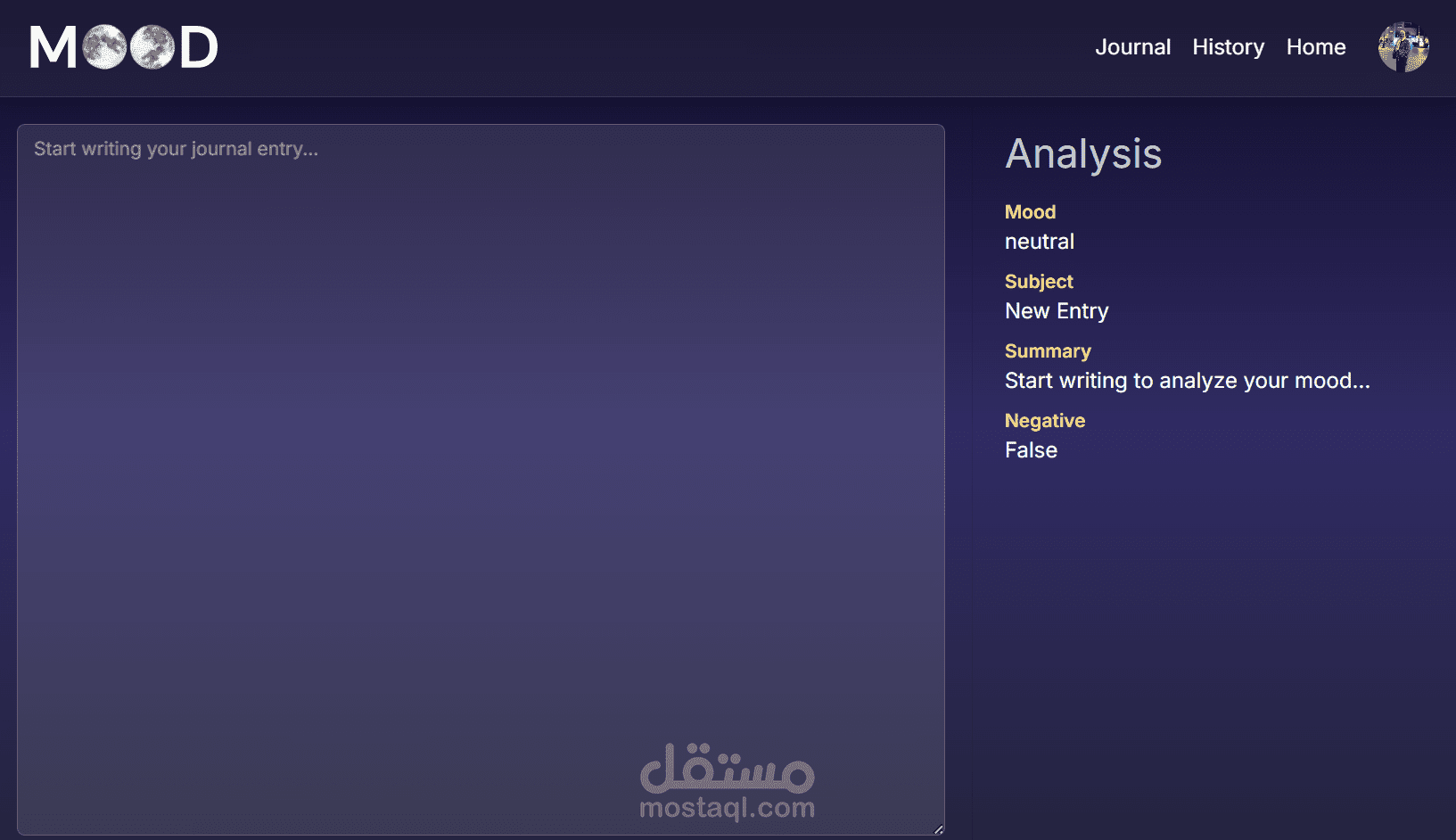 يهدف هذا المشروع إلى إنشاء تطبيق ويب لتدوين اليوميات وتحليل الحالة المزاجية باستخدام تقنيات الذكاء الاصطناعي. يتيح للمستخدم كتابة مذكراته اليومية، ثم يقوم النظام بتحليل النص لتحديد المزاج العام، وموضوع اليوم، ودرجة الإيجابية أو السلبية، إضافةً إلى توليد لون معبر عن الحالة النفسية.