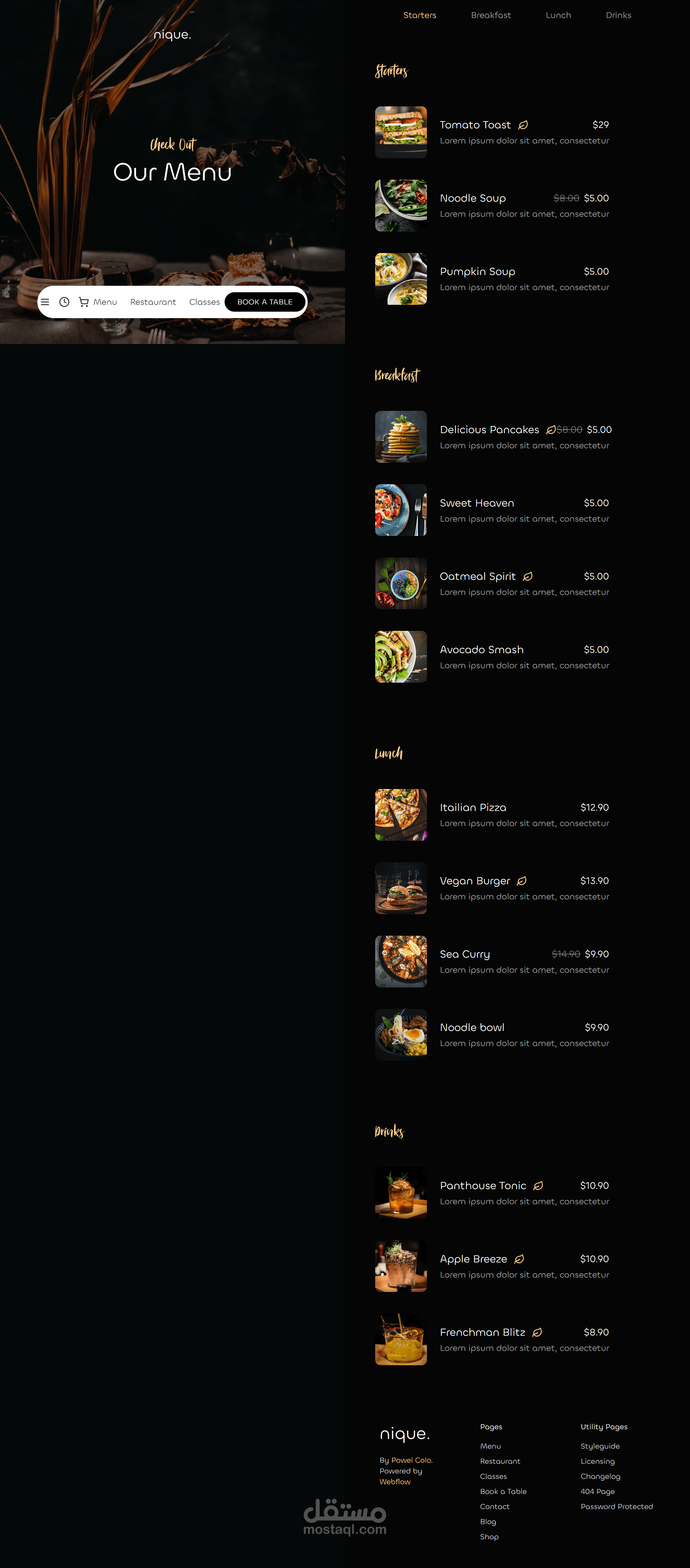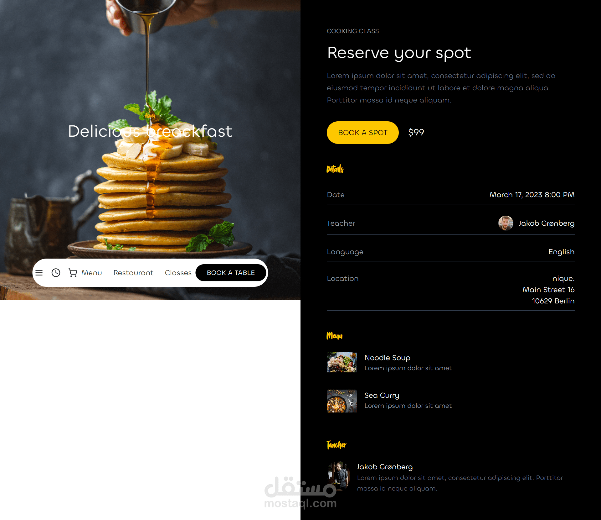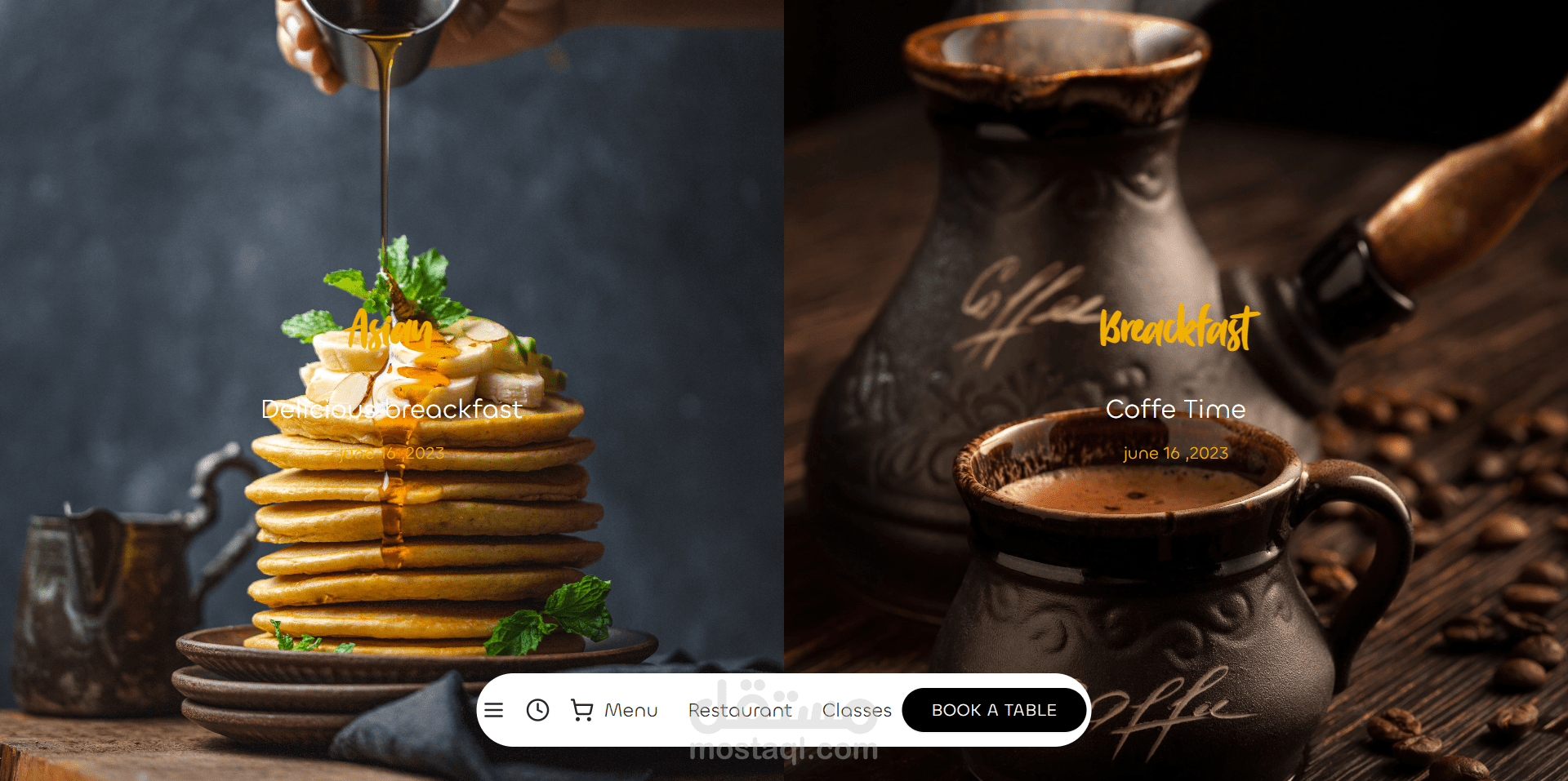 Modern Restaurant Website هو موقع مطعم أنيق ومصمم بعناية باستخدام React.js و Tailwind CSS مع تأثيرات حركة ناعمة لجعل تجربة المستخدم أكثر جاذبية وهدوءًا.