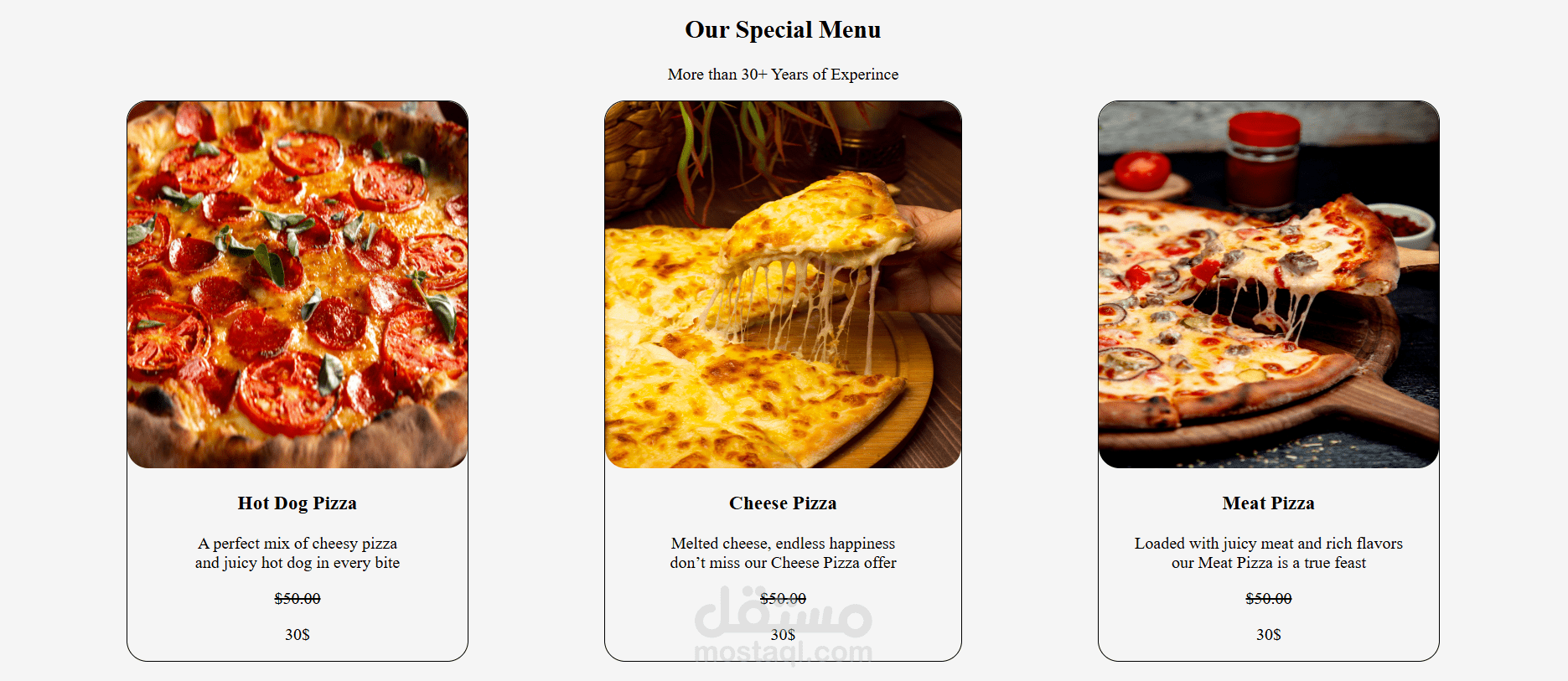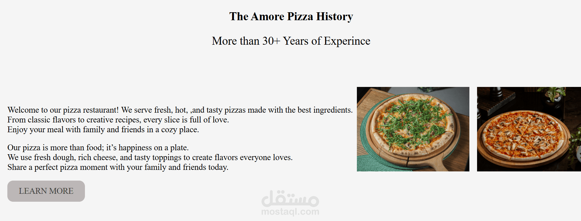 تتكوّن الصفحة من أربع صفحات فرعية متكاملة، بتصميم عصري وجذاب يعكس هوية المطعم ويُبرز الأطباق بطريقة احترافية.