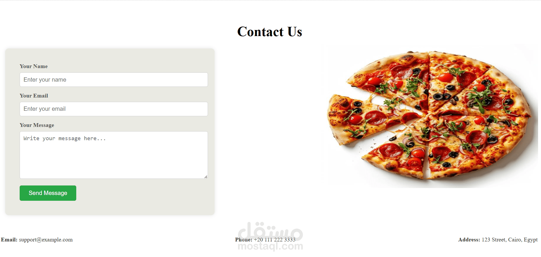 Contact – صفحة تواصل بسيطة بها نموذج لإرسال الرسائل وبيانات التواصل.