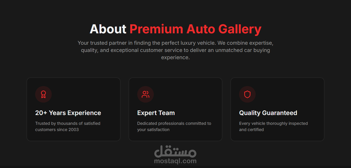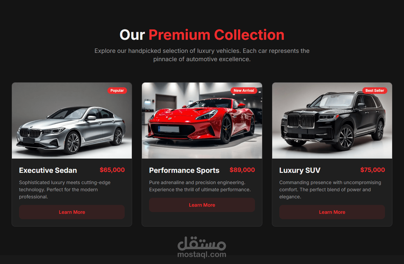 Home: قسم رئيسي جذاب بخلفية سيارات فخمة وزر دعوة لاتخاذ إجراء.