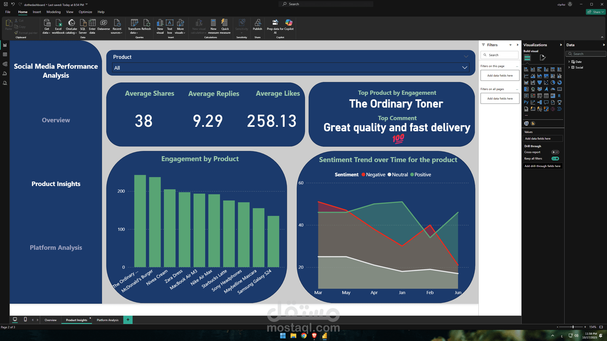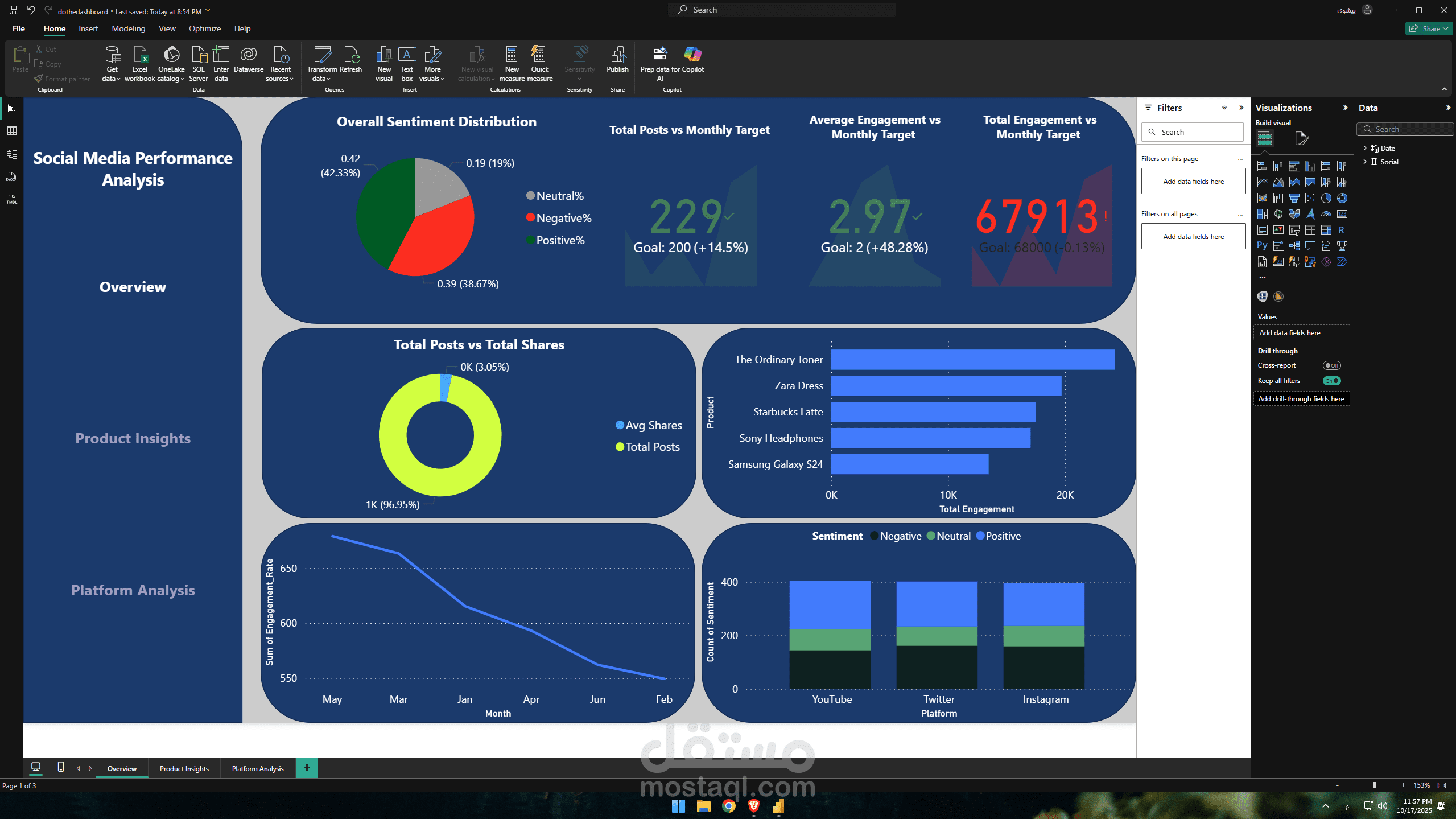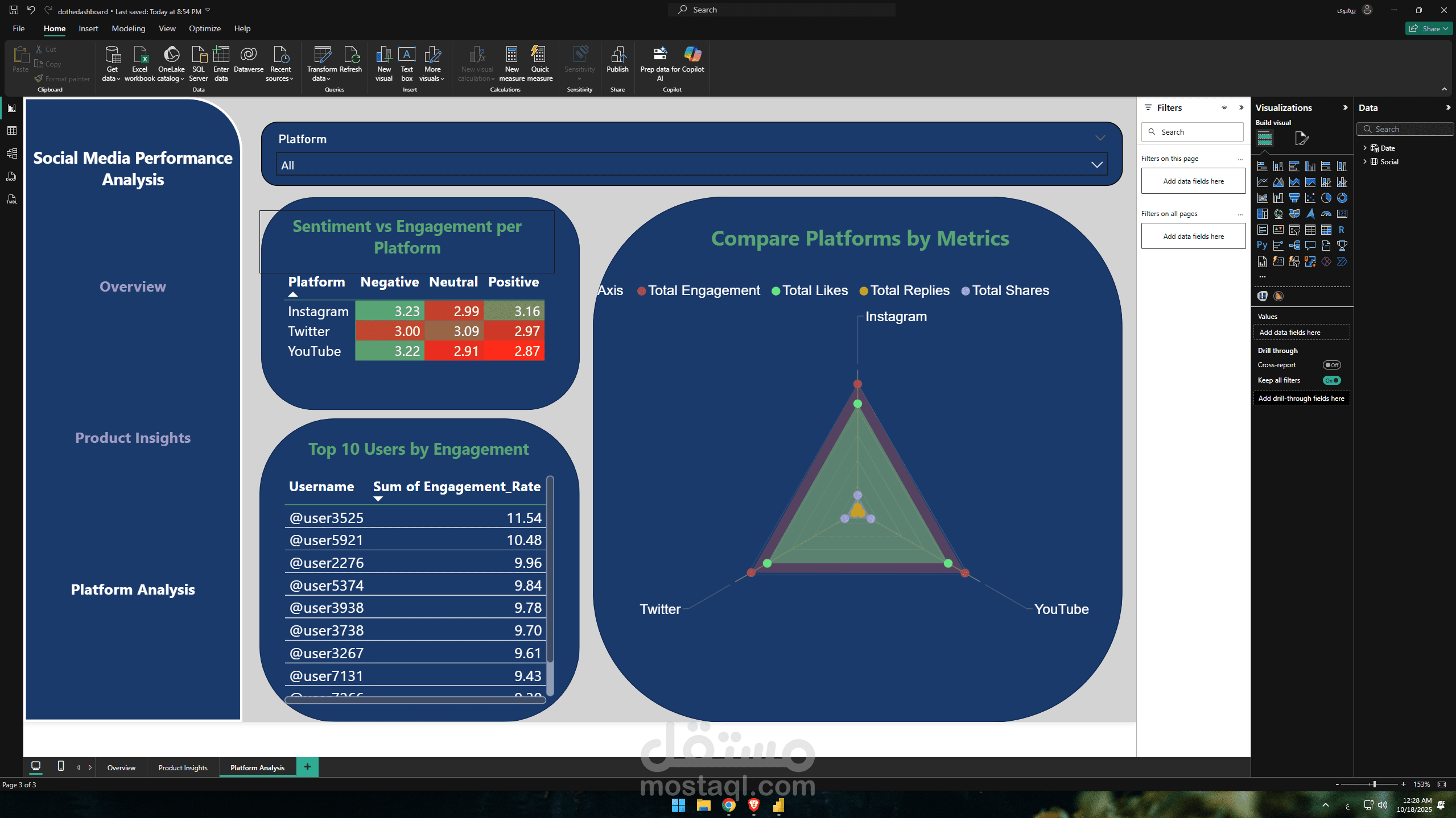 تحليل بيانات السوشيال ميديا وتصميم داشبورد Power BI تفاعلي يعرض أداء المنصات المختلفة مثل Instagram وTwitter وYouTube بطريقة احترافية تساعد على اتخاذ قرارات دقيقة مبنية على البيانات.