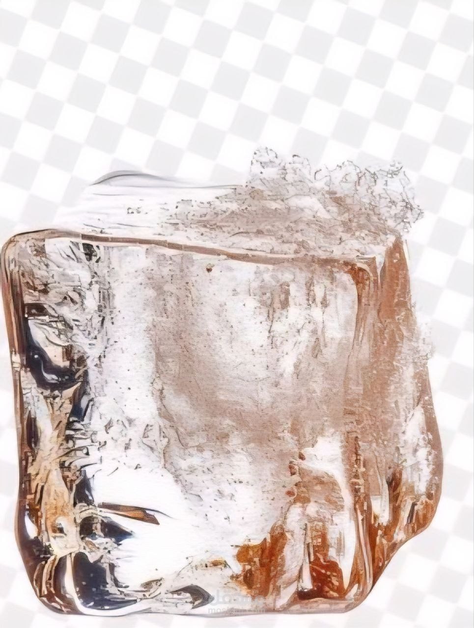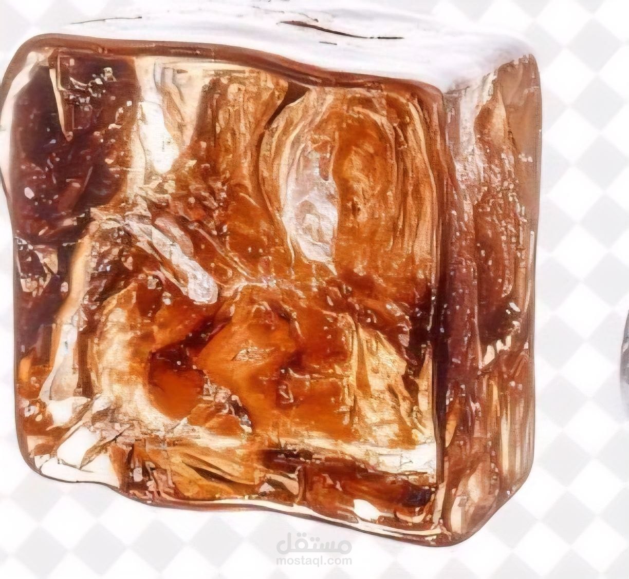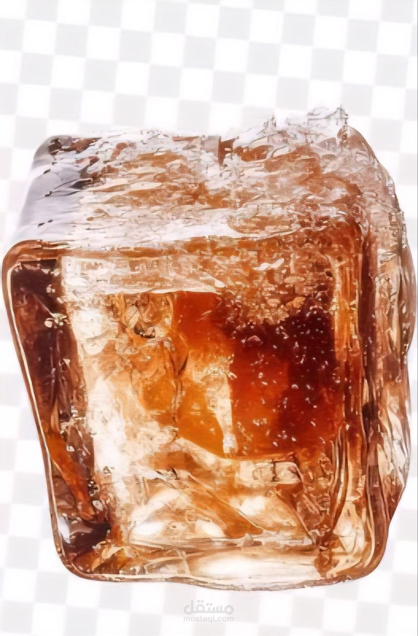 يتميّز التصميم بتوازن الألوان الدافئة والباردة، حيث يعكس اللون البني إحساس القهوة الغنية، بينما تضيف مكعبات الثلج الشفافة إحساساً بالانتعاش والتجدد. توزيع حبوب القهوة حول العبوة يضيف واقعية ويعزز تركيز العين على المنتج الرئيسي، في حين يظهر النص الكبير “ICED COFFEE” بخلفية شفافة ليكمل التكوين دون أن يطغى عليه.
