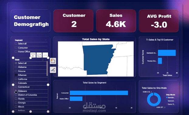 A single interactive dashboard presenting clear KPIs (Sales, Profit, Quantity, Top Customers, Top Products) with slicers and a timeline for fast filtering.