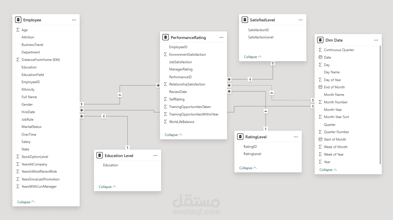 Data Modeling — designed a Star Schema linking fact tables with DimDate, DimEducation, DimRating.