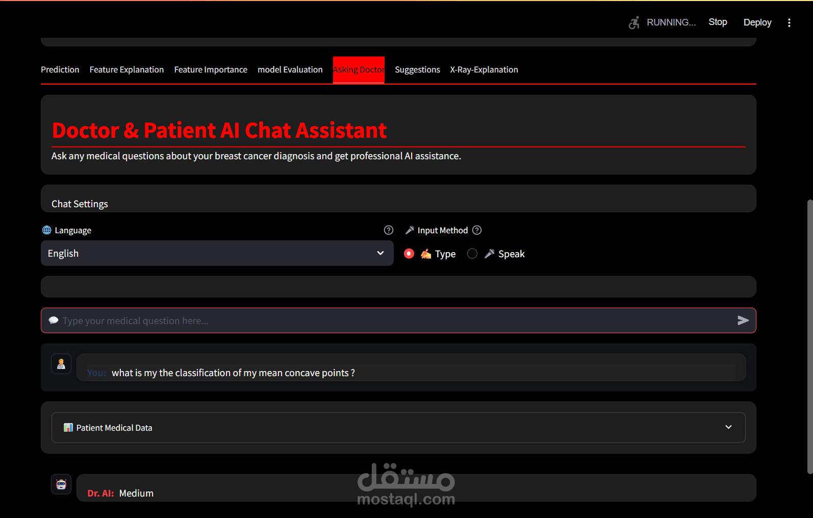 Integrated a bilingual (Arabic/English) AI medical chatbot with real-time speech recognition to assist patients interactively.