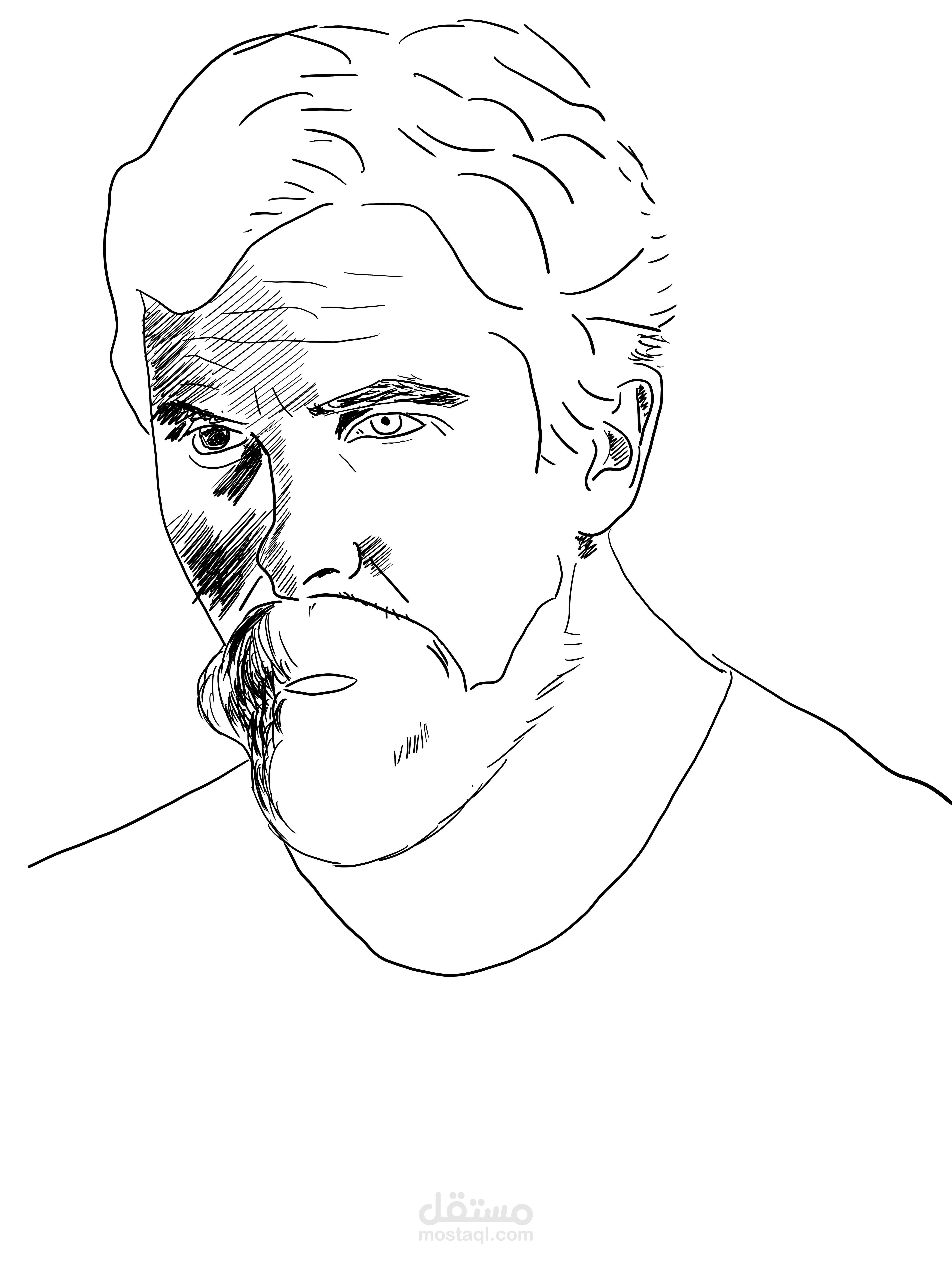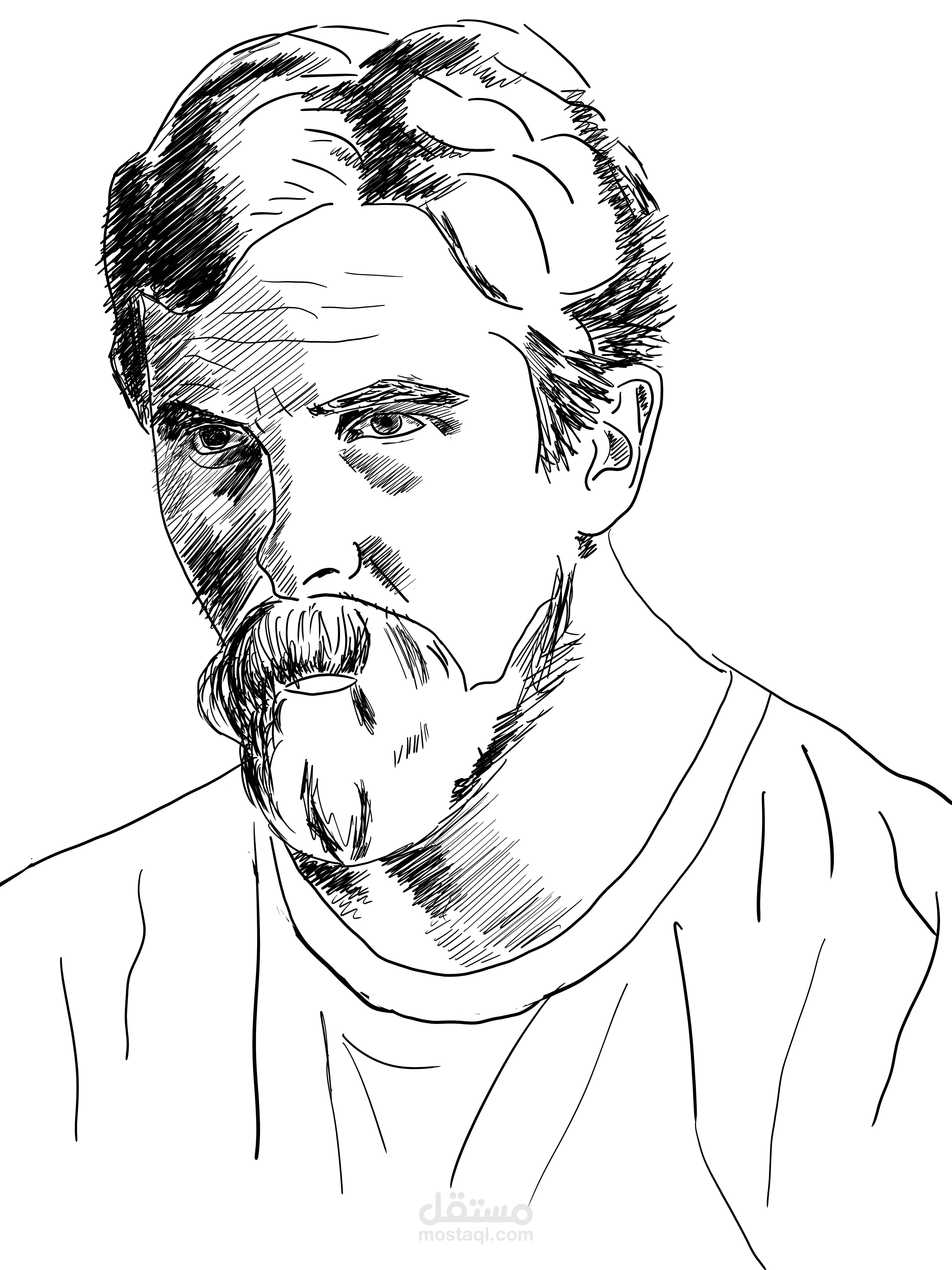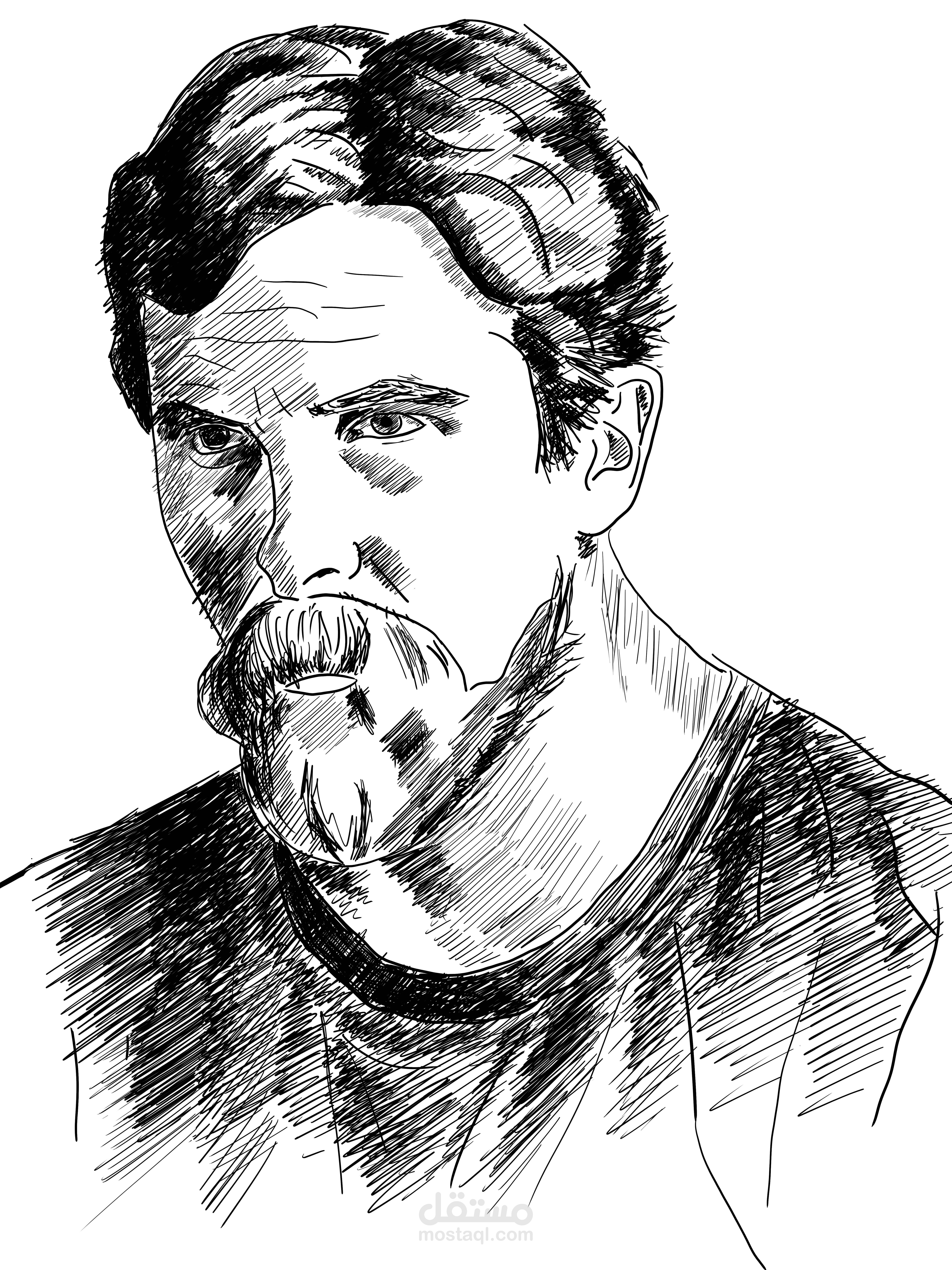 اسكتش لوجه الممثل كريستيان بيل، برسمة حرّة وخطوط سريعة تُبرز ملامحه المميزة، خاصة عينيه الحادتين وشكل فمه. التظليل الخفيف يُضفي عمقاً وانطباعاً عن شخصيته القوية.