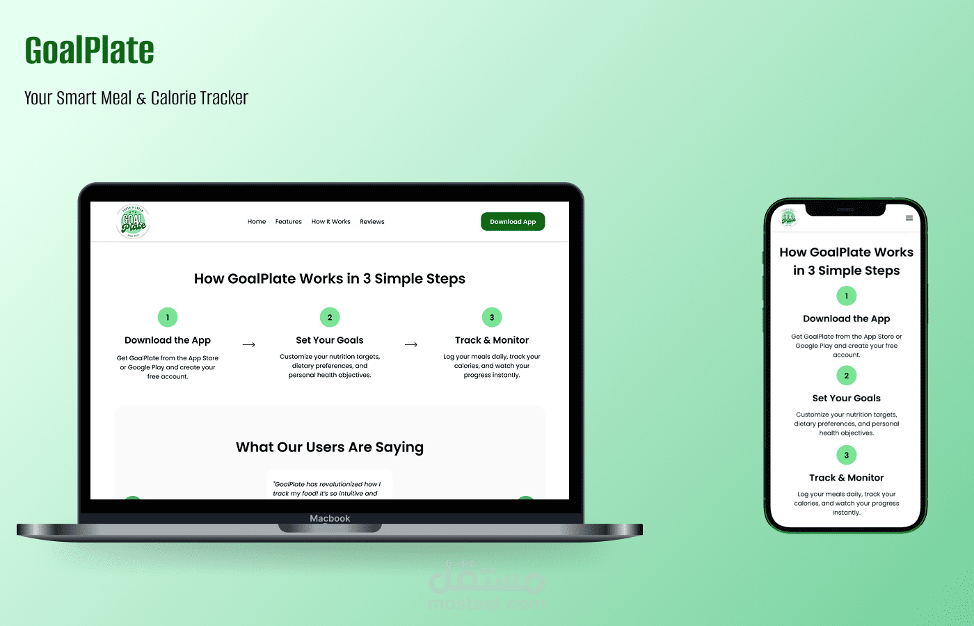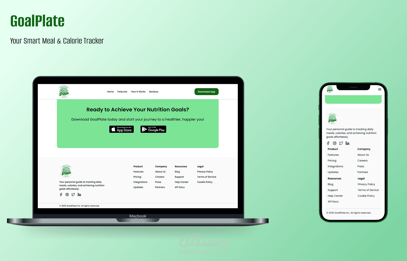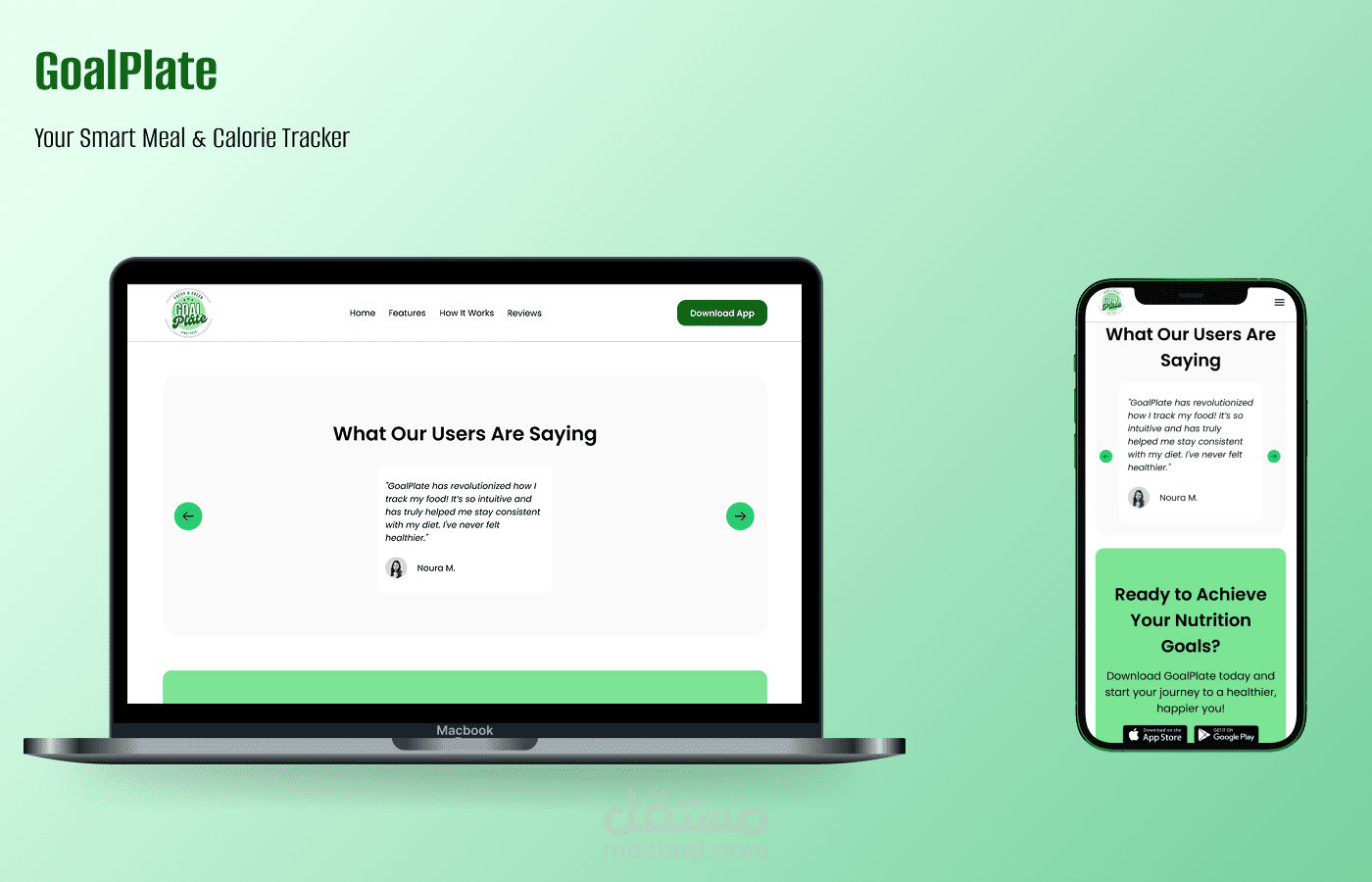 قمت بتصميم صفحة هبوط (Landing Page) لتطبيق GoalPlate بهدف تعريف الزوار بفكرة التطبيق وتشجيعهم على تحميله وتجربته.