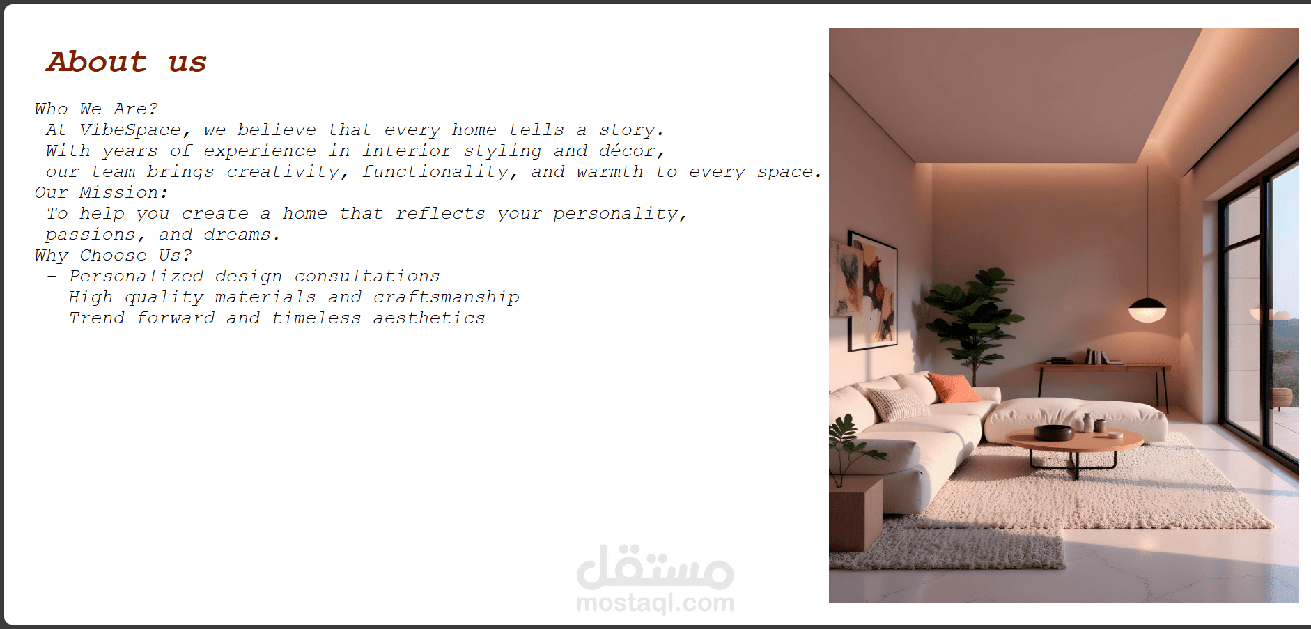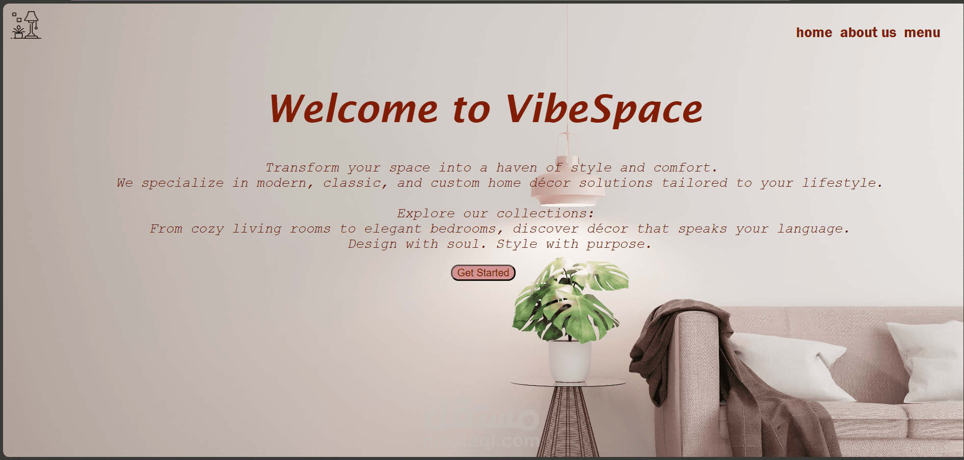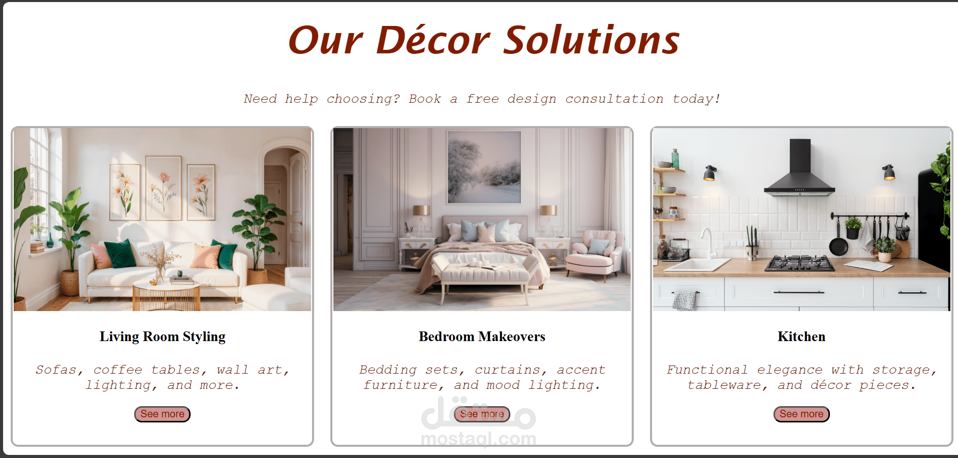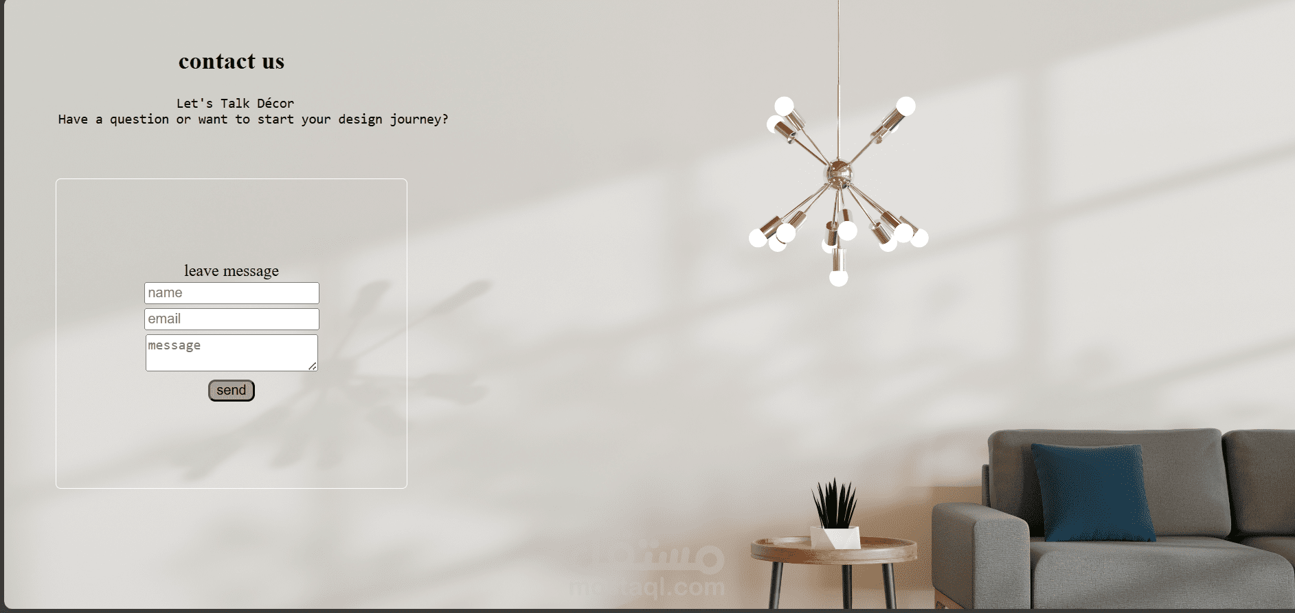 هذا العمل عبارة عن صفحة ويب تفاعلية لمتجر ديكور داخلي تهدف إلى عرض خدمات التصميم والمنتجات بطريقة أنيقة وسهلة التصفح.