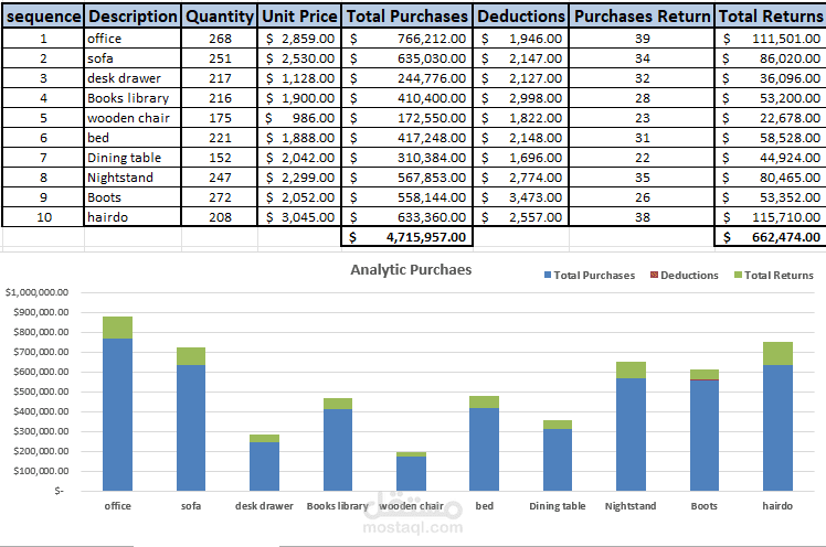 Analytic Purchases Dashboard: Displays total purchases, deductions, and return rates for each product category with a visual bar chart.